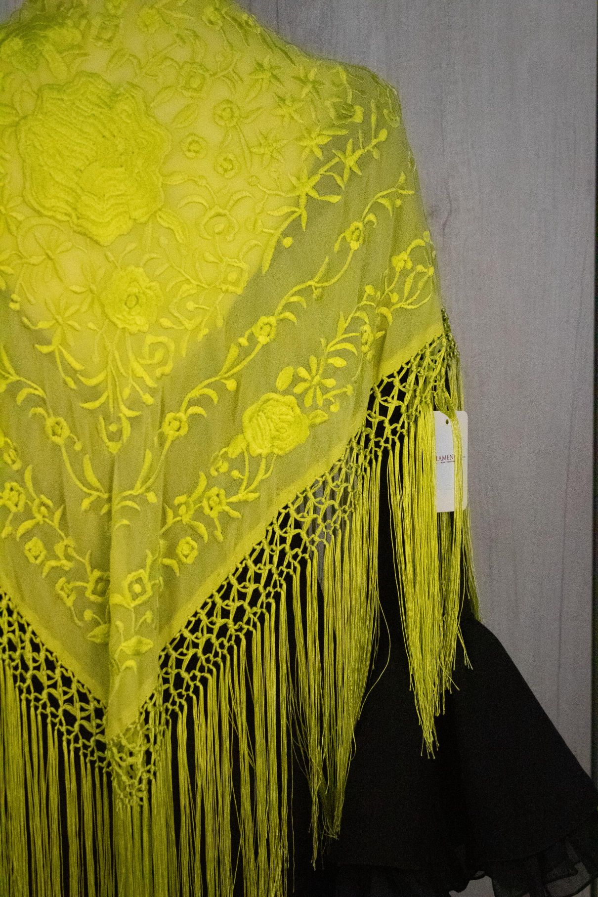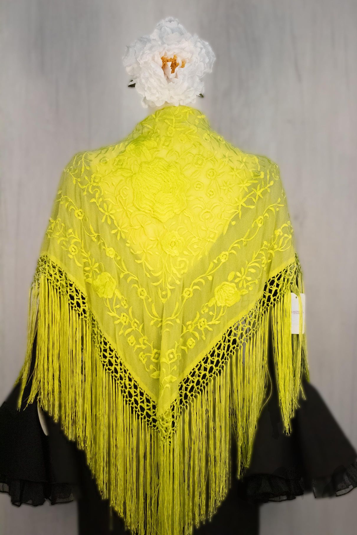 Mantón verde lima de seda con bordado en hilo de seda al tono con un espectacular diseño de flores. Enrejado y flecado a mano en seda 100% natural en la provincia de Sevilla.
