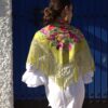 Mantón verde verde menta de seda con bordado en hilo de seda al tono con un espectacular diseño de flores. Enrejado y flecado a mano en seda 100% natural en la provincia de Sevilla.