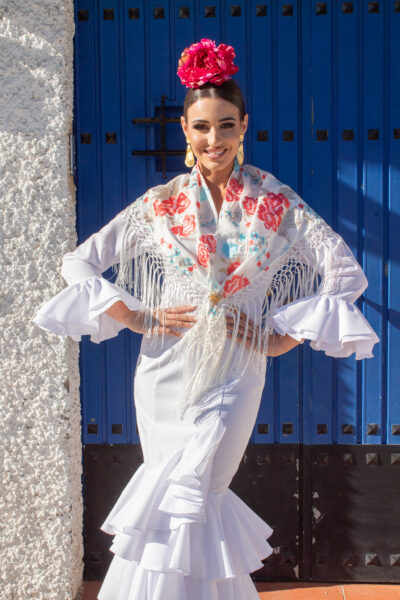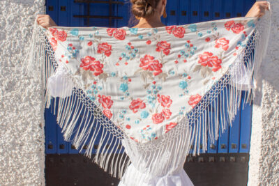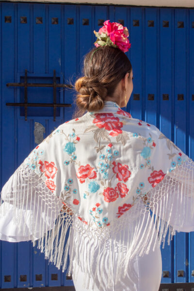 Mantoncillo de seda blanco con bordado coral y aguamarina