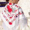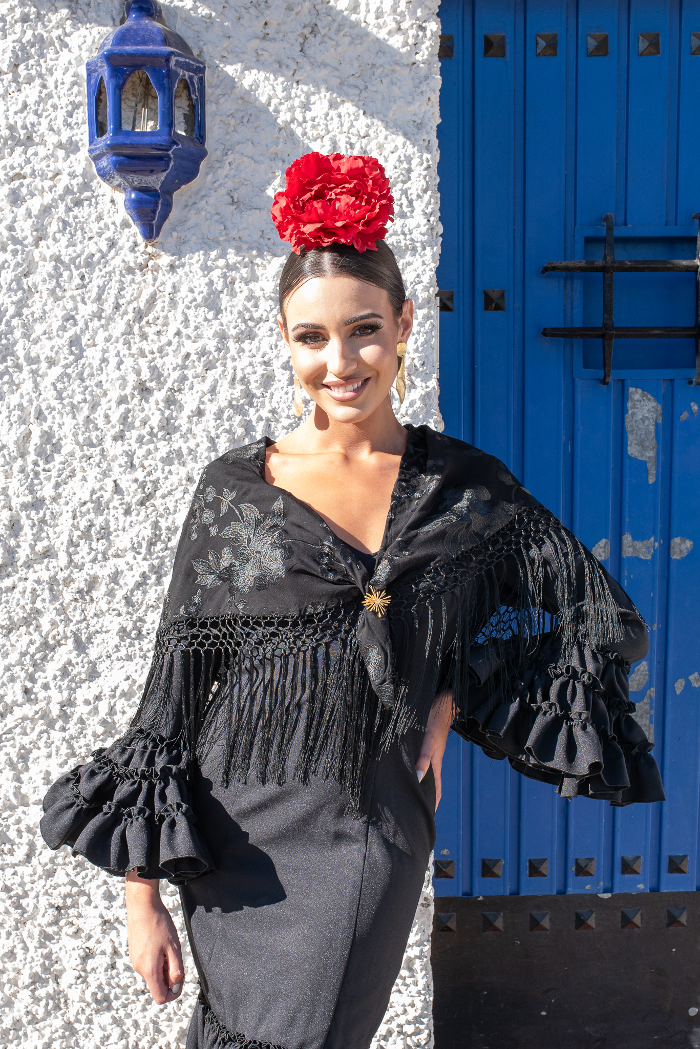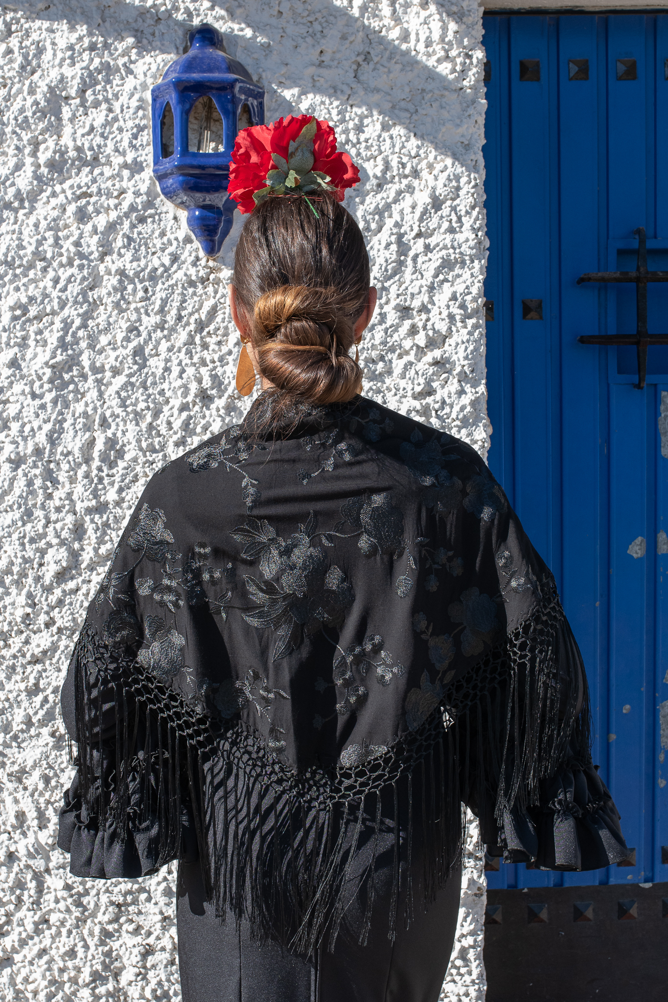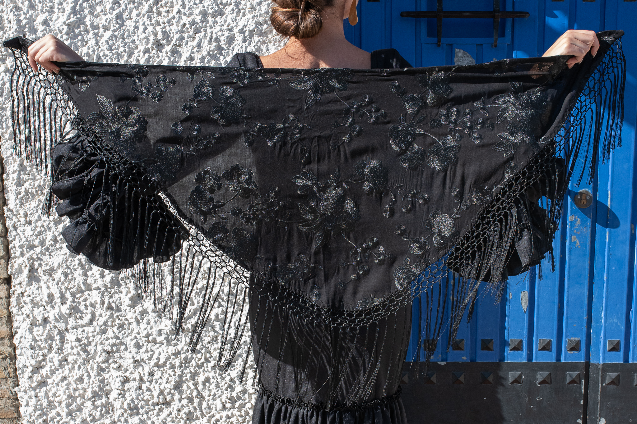 Mantoncillo de seda negro con bordado al tono con un espectacular diseño de flores. Enrejado y flecado a mano en seda 100% natural en la provincia de Sevilla.