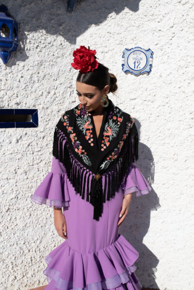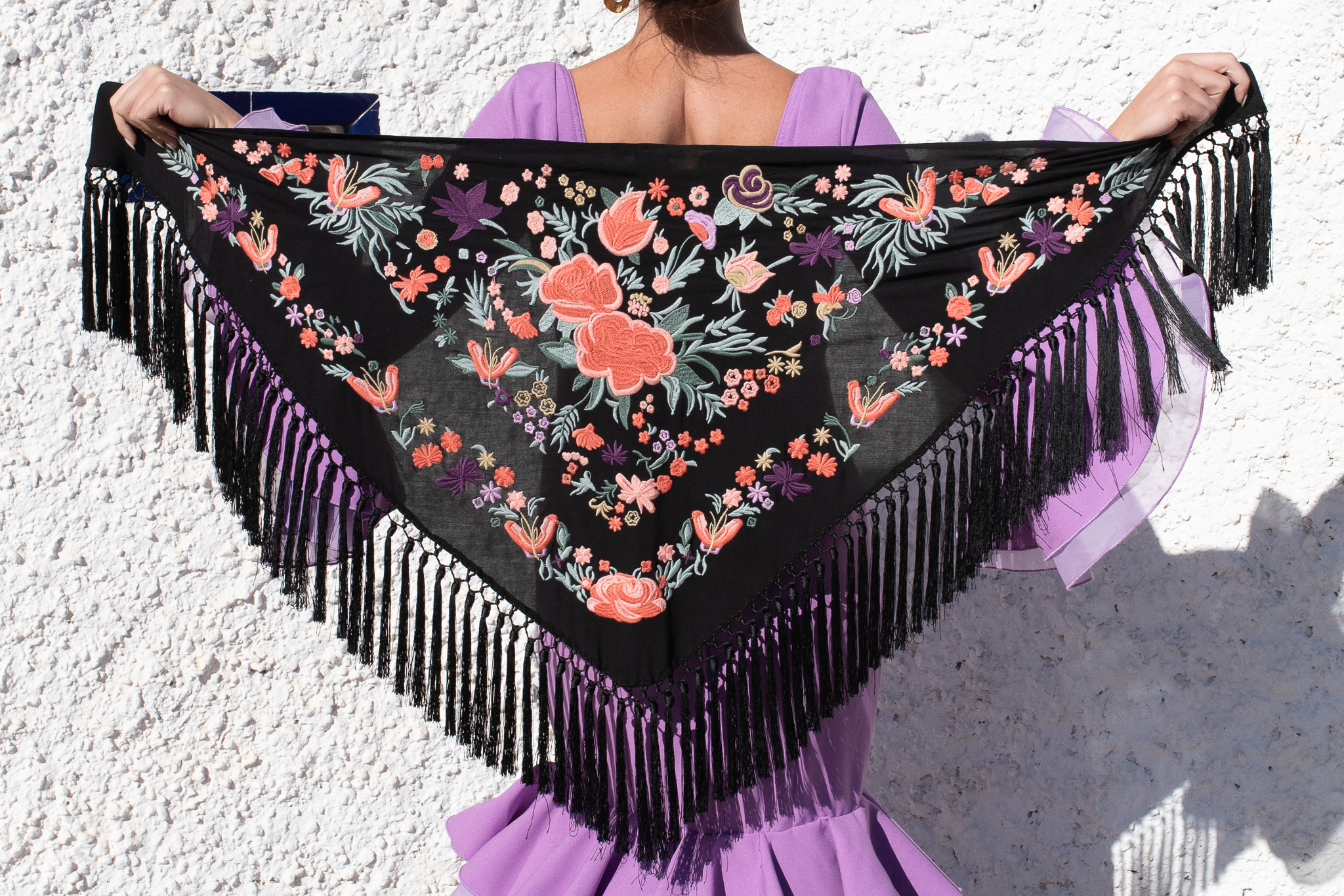 Mantón Gabriela en color negro de algodón con bordado coral en hilo mate de seda