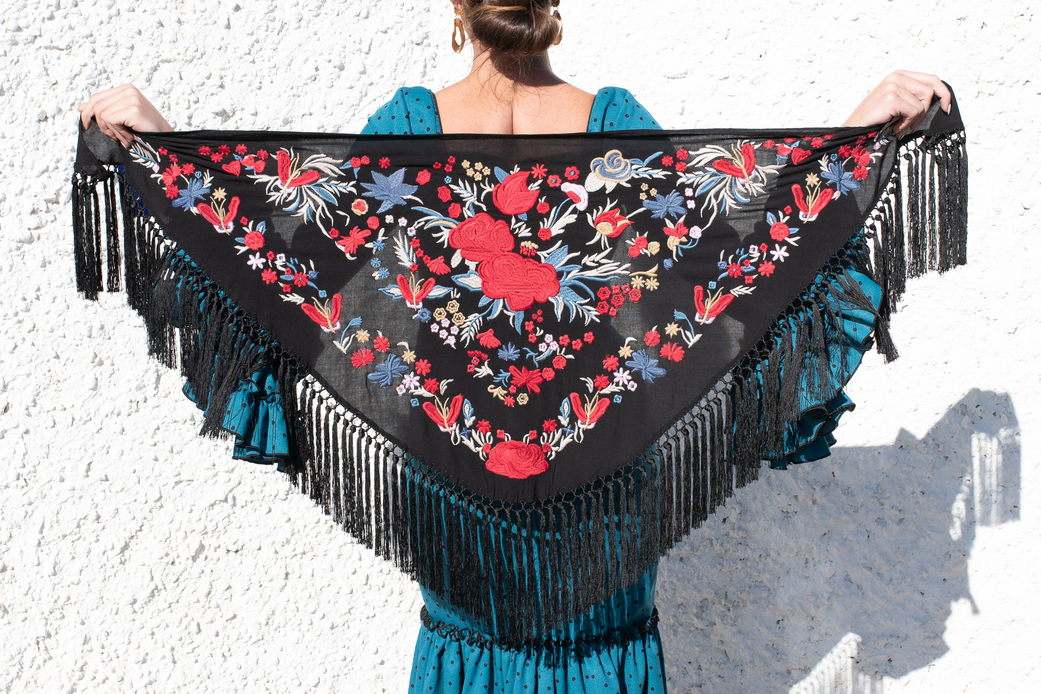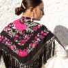 Mantón Gabriela en color negro de algodón con bordado rojo en hilo mate de seda