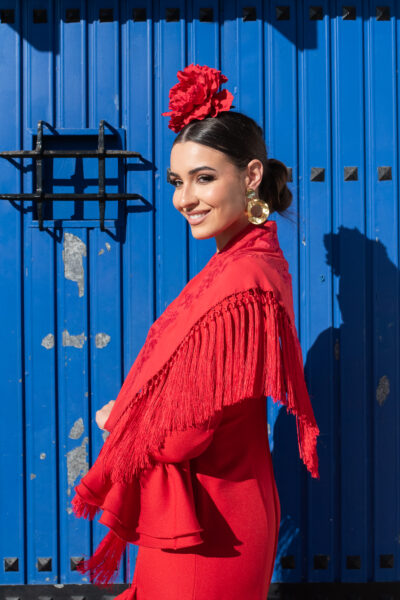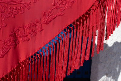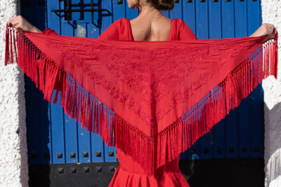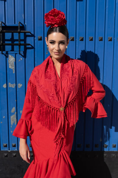 Mantón Gabriela en color rojo de algodón con bordado al tono en hilo mate de seda