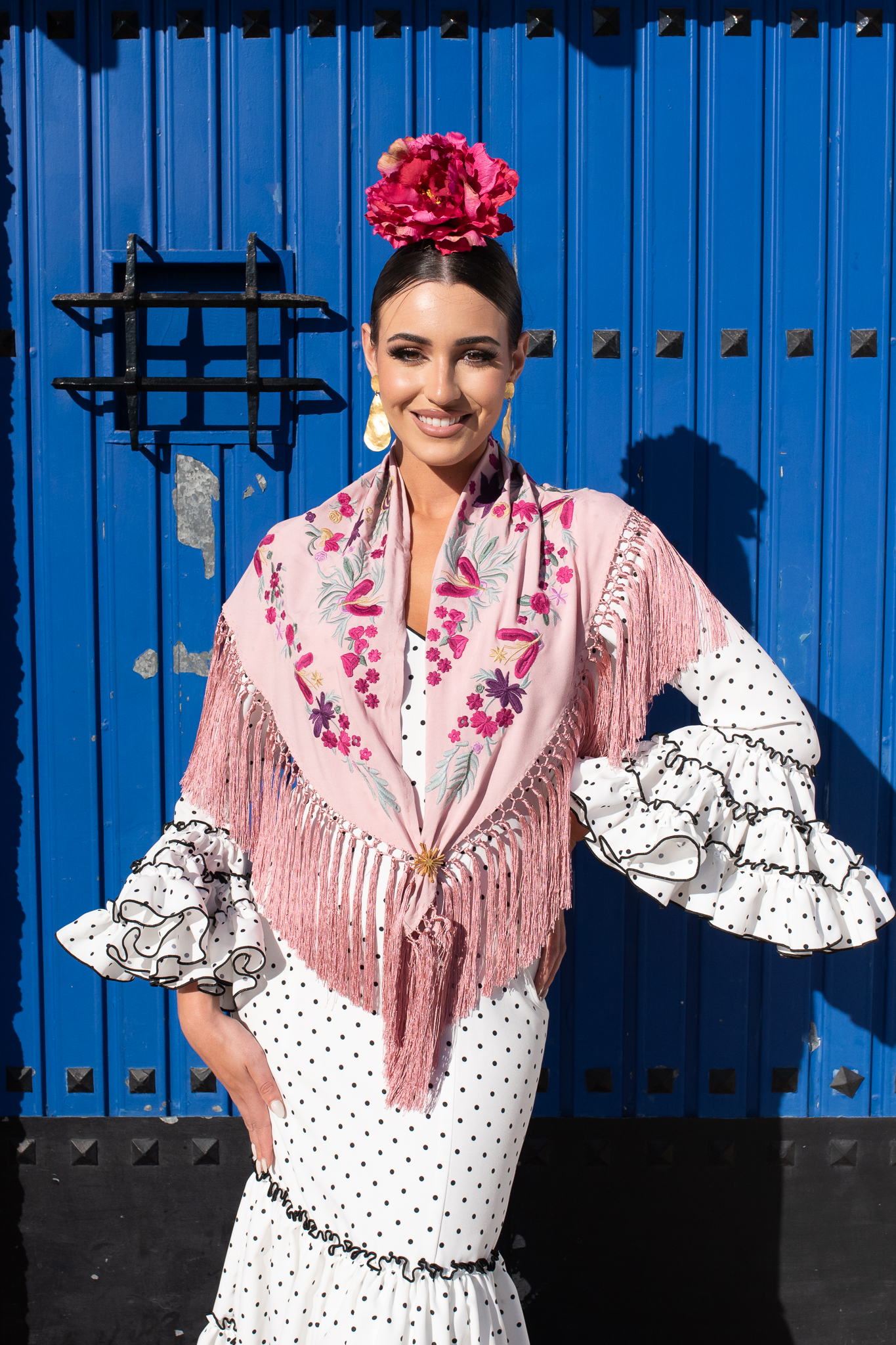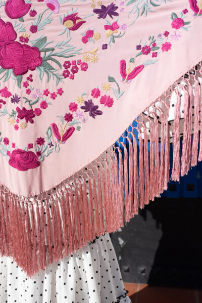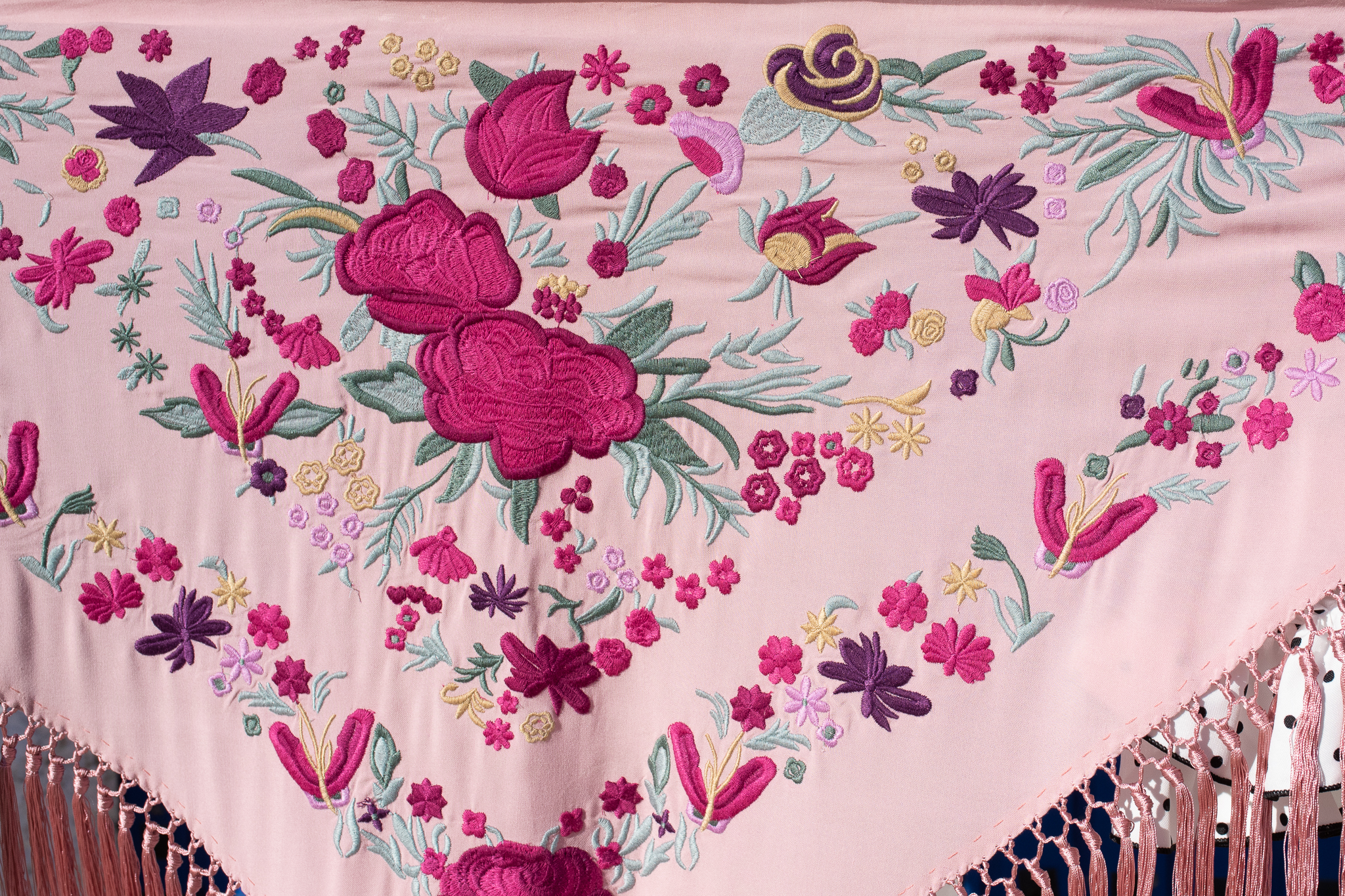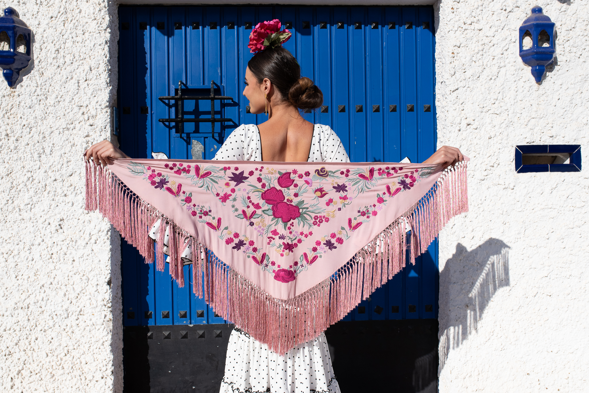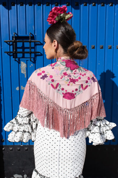Mantón Gabriela en color rosa bebé de algodón con bordado multicolor en hilo mate de seda