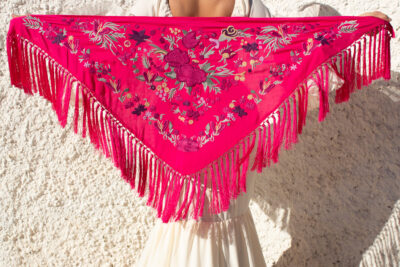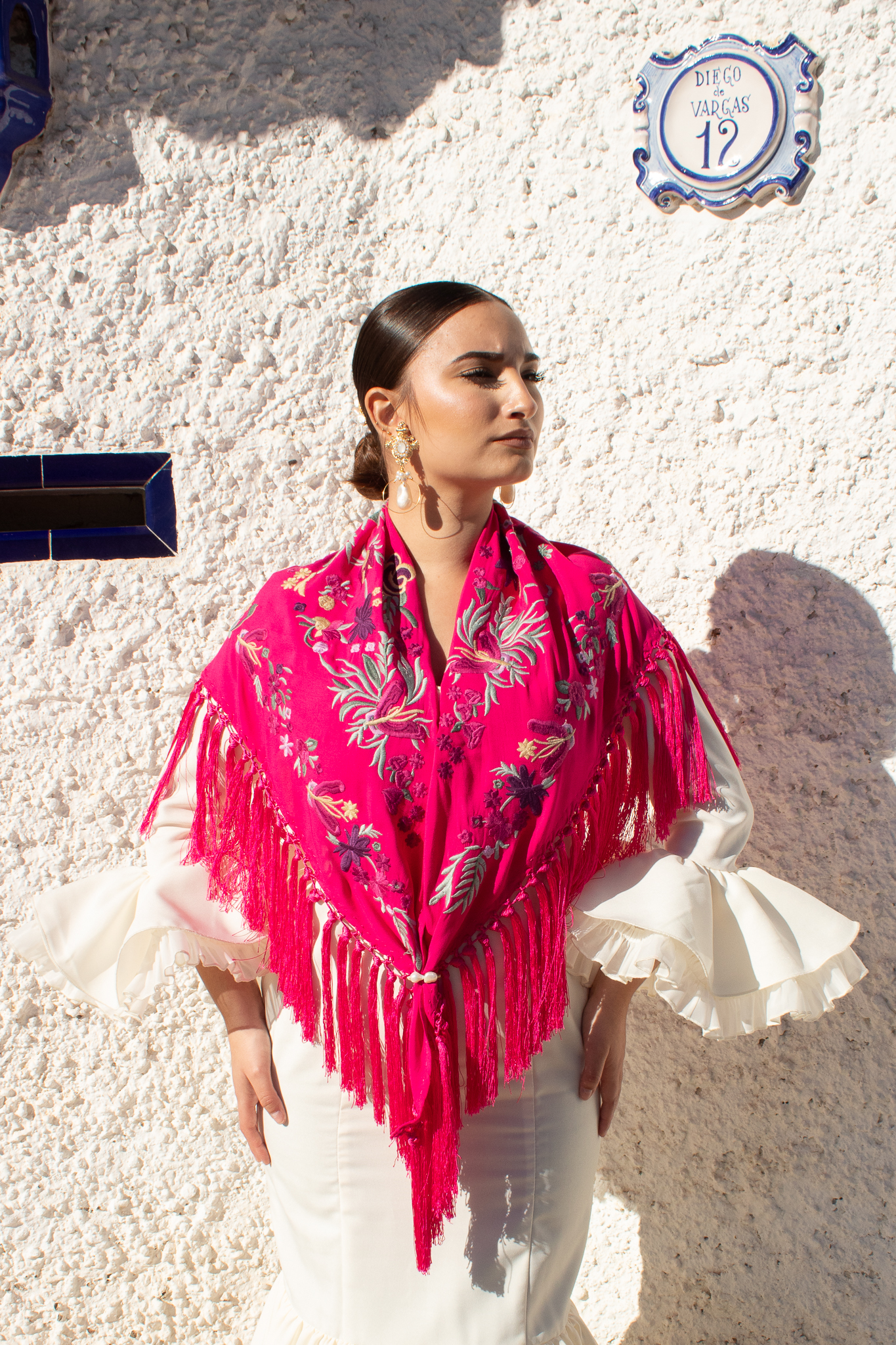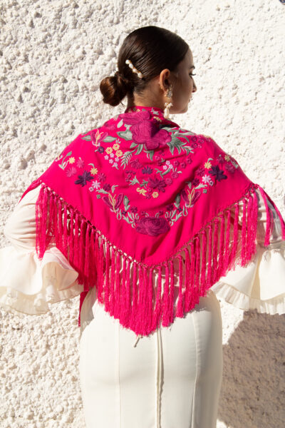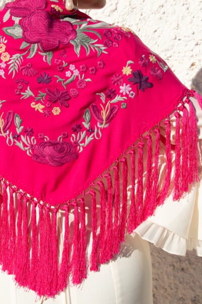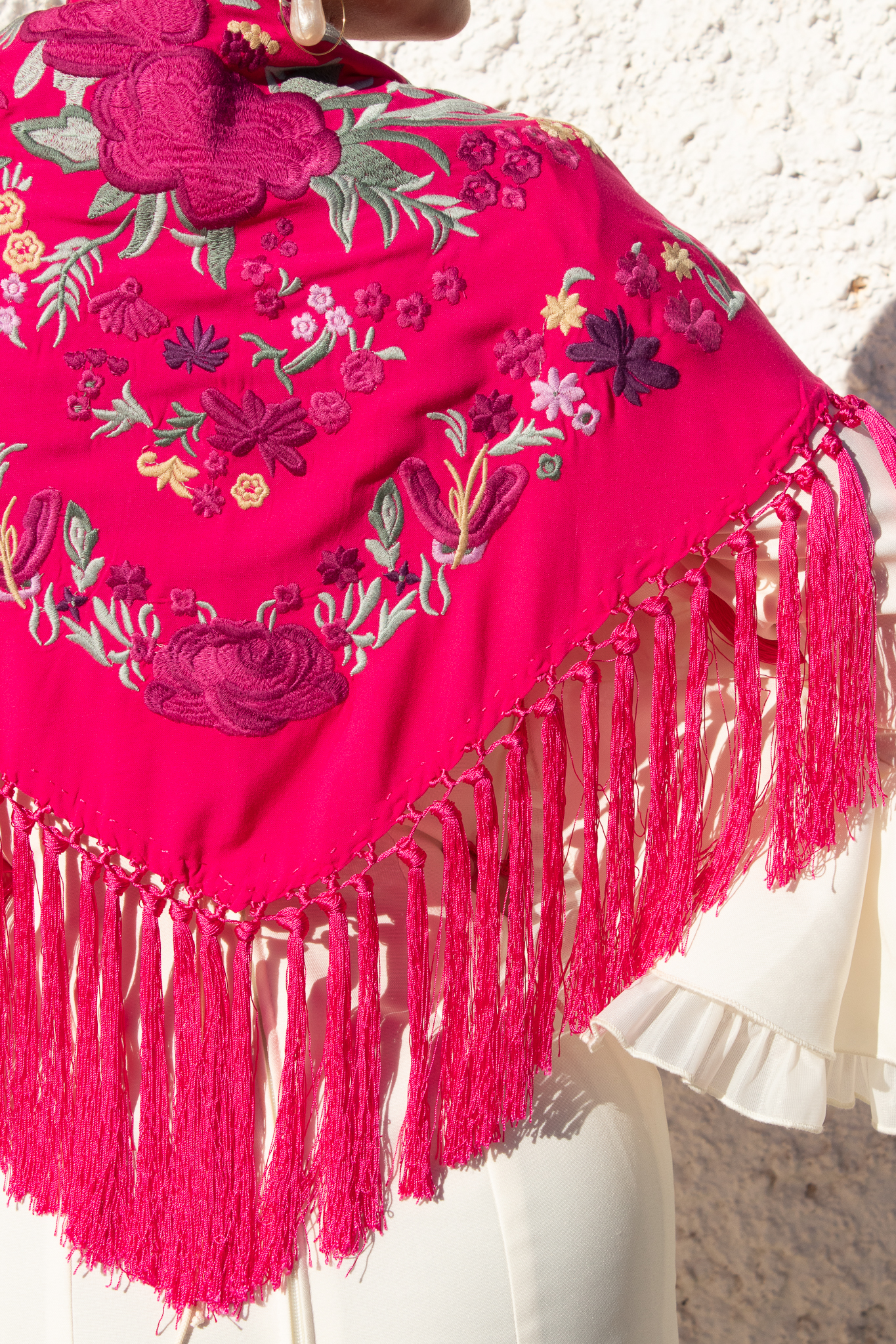 Mantón Gabriela en color rosa fucsia de algodón con bordado multicolor en hilo mate de seda