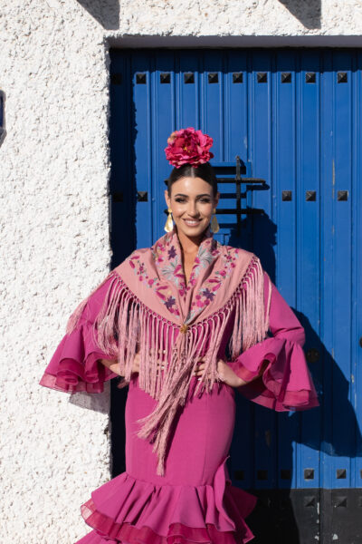 Mantón Gabriela en color rosa maquillaje de algodón con bordado multicolor en hilo mate de seda consiguiendo el efecto envejecido que tanto es tendencia este 2025.