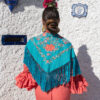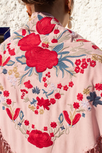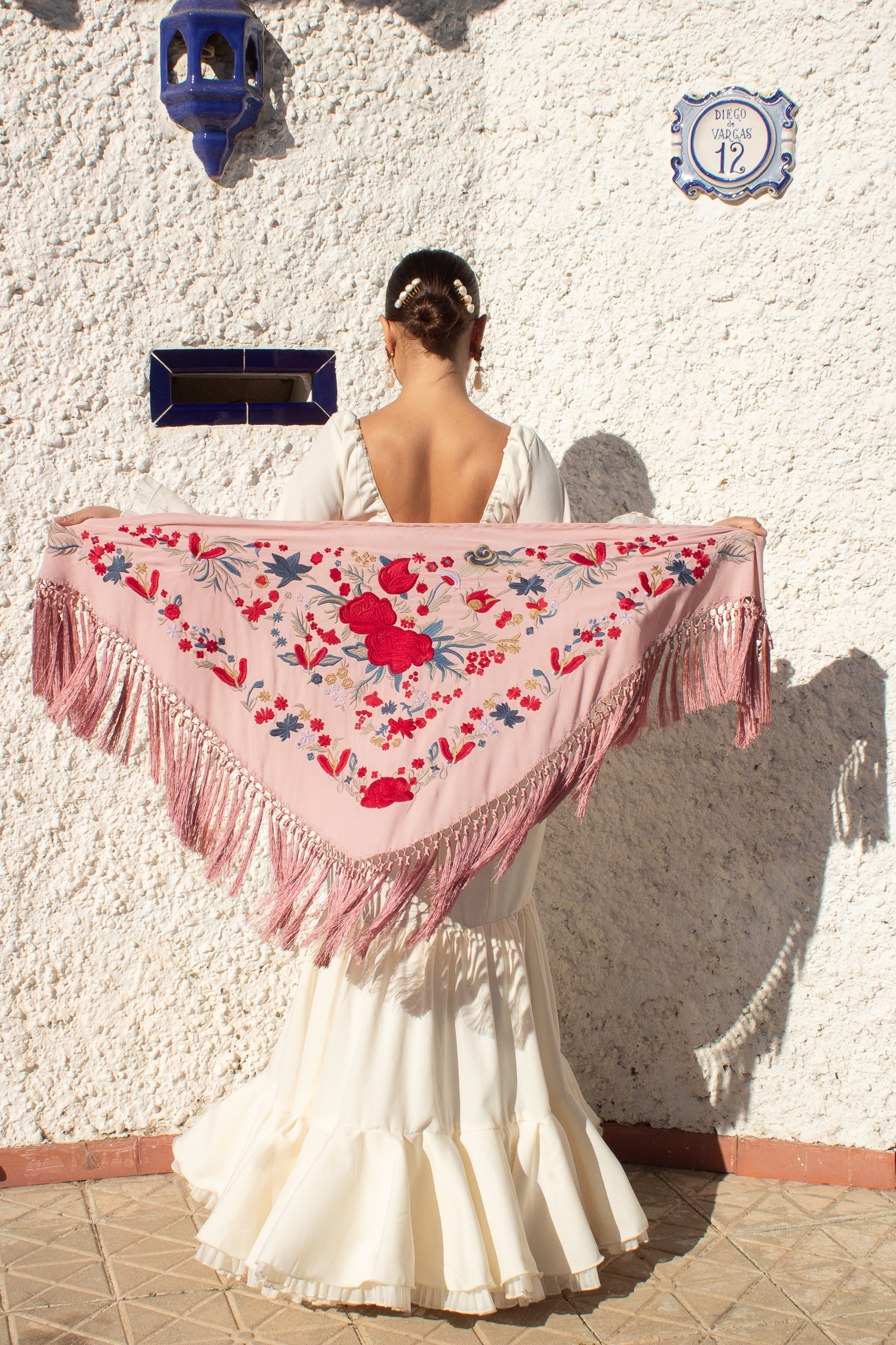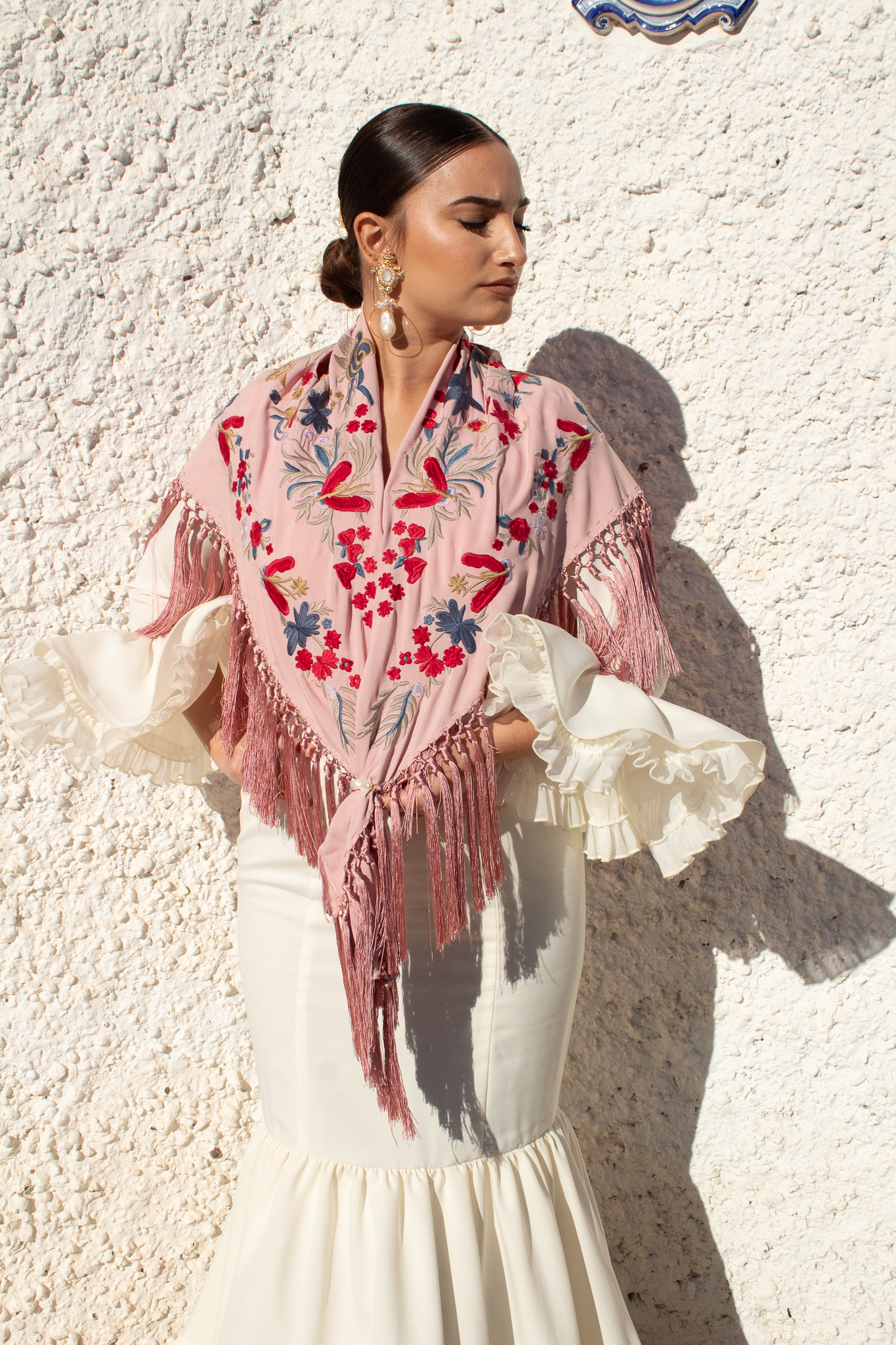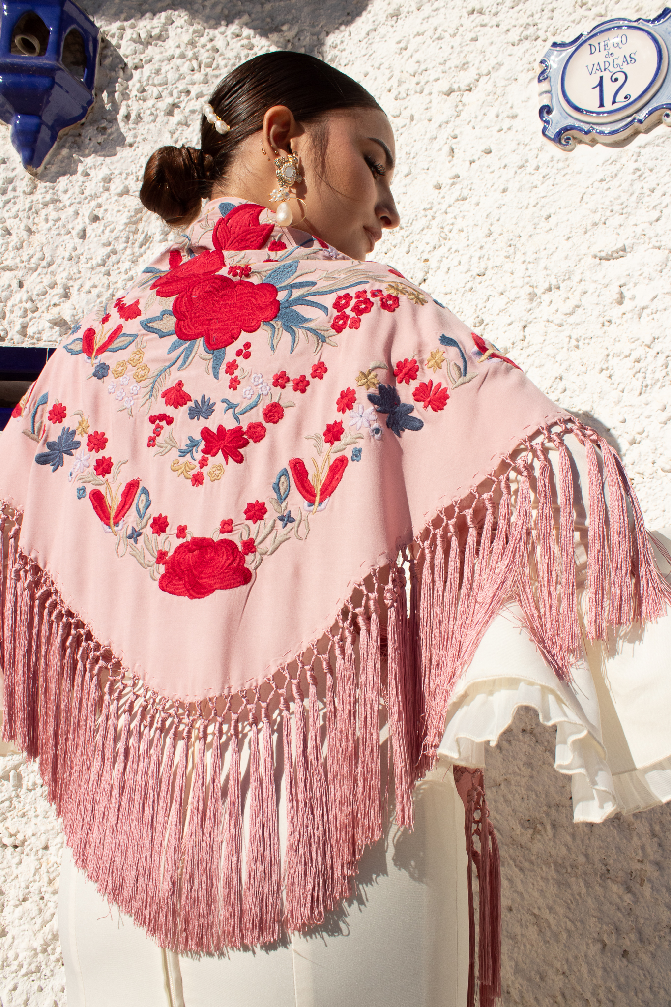 Mantón Gabriela en color rosa palo de algodón con bordado multicolor en hilo mate de seda