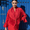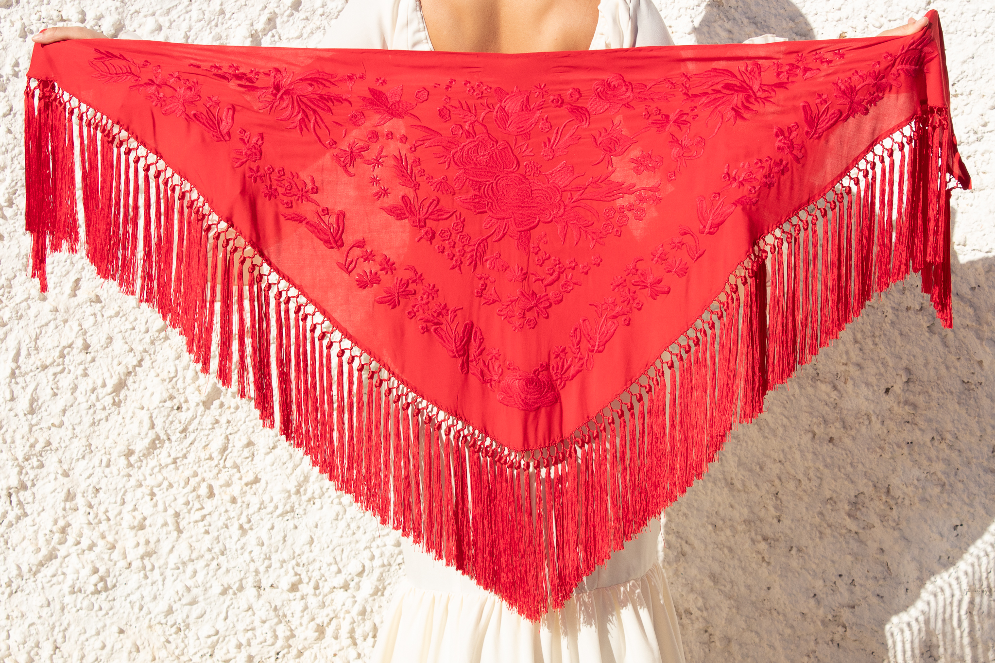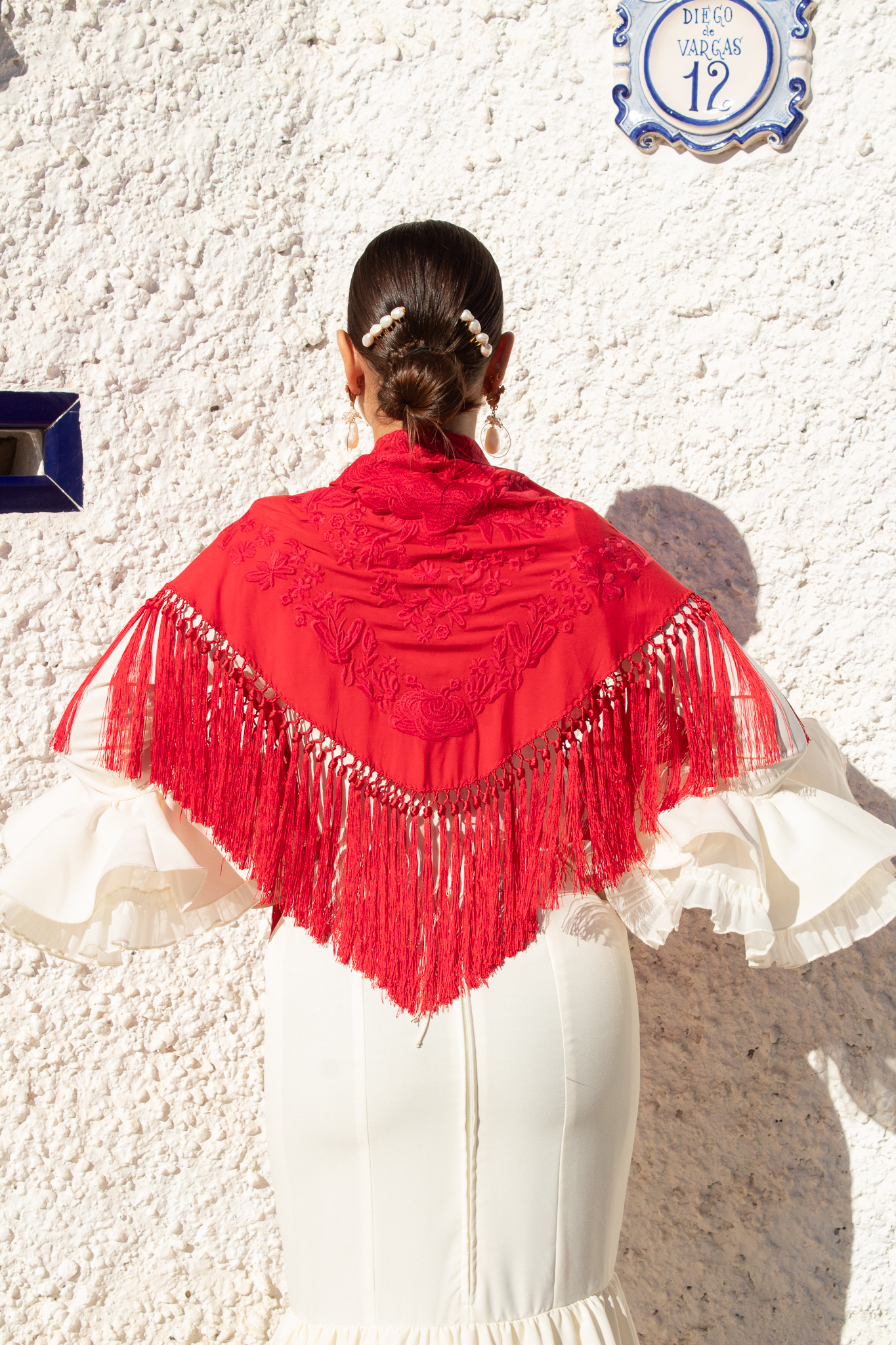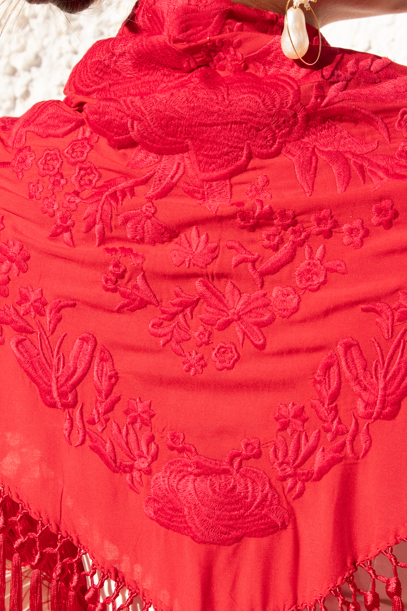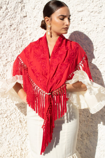 Mantón Gabriela en color rosa sandía al tono de algodón con bordado multicolor en hilo mate de seda
