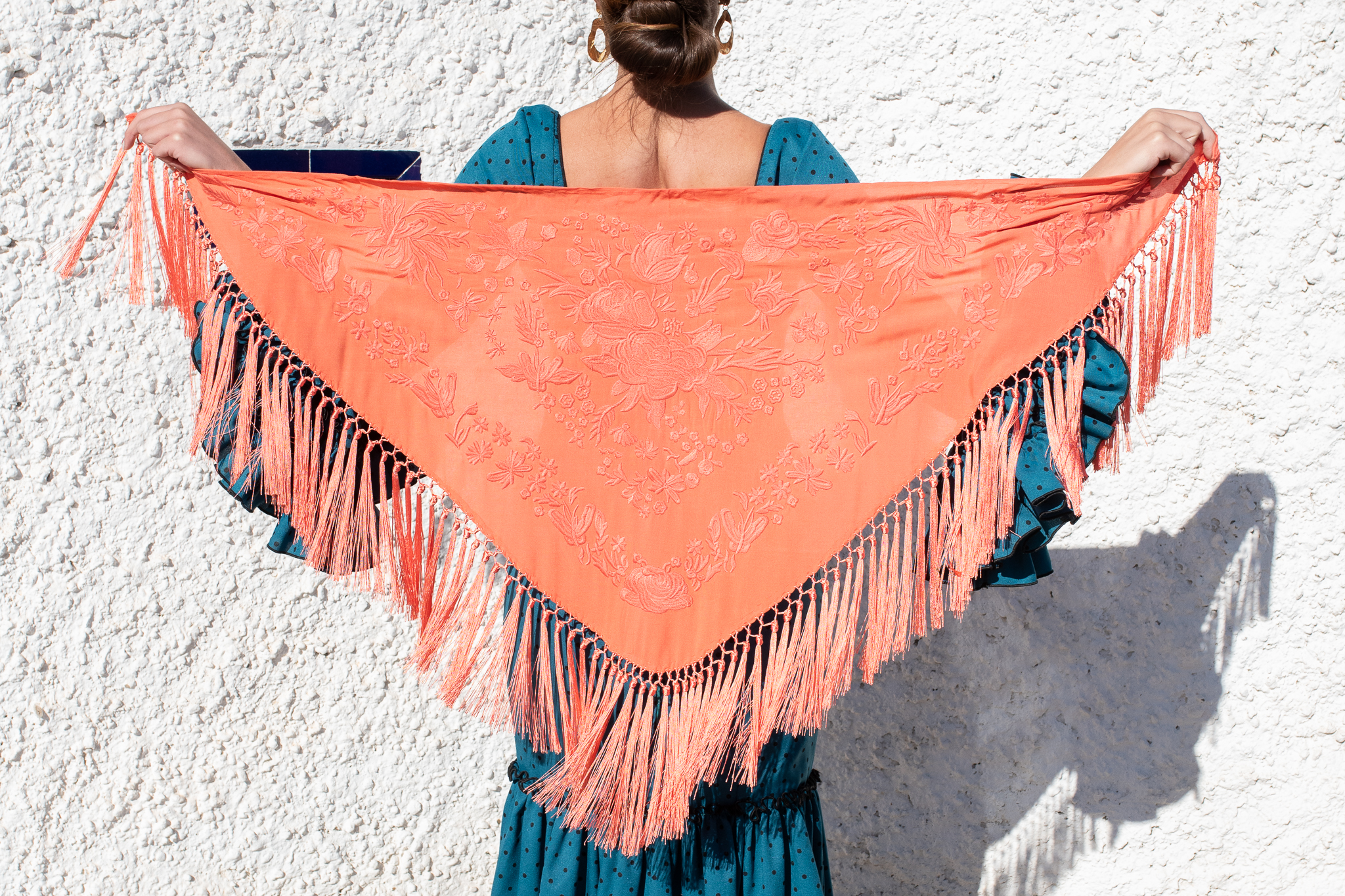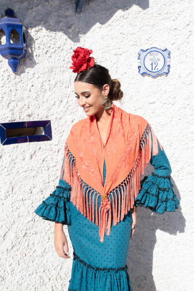 Mantón Gabriela en color salmón de algodón con bordado al tono en hilo mate de seda