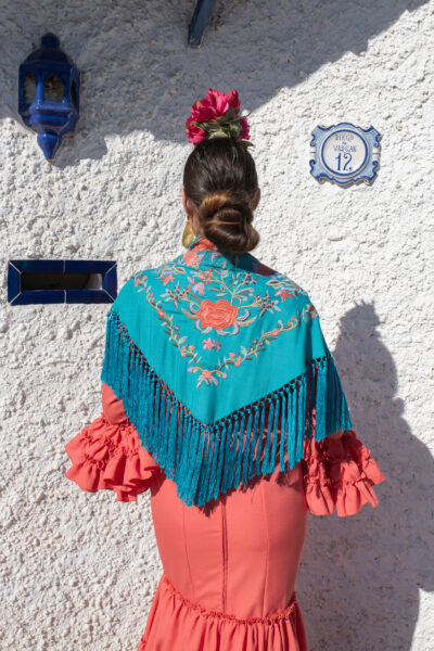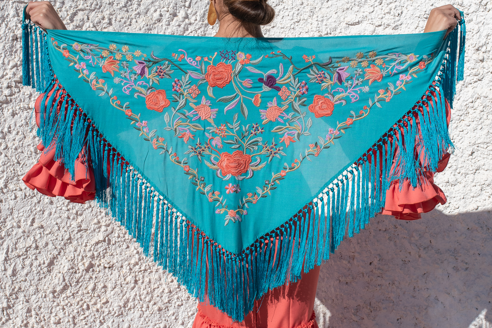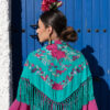 Mantón Gabriela en color Turquesa de algodón con bordado coral en hilo mate de seda consiguiendo el efecto envejecido que tanto es tendencia este 2025.