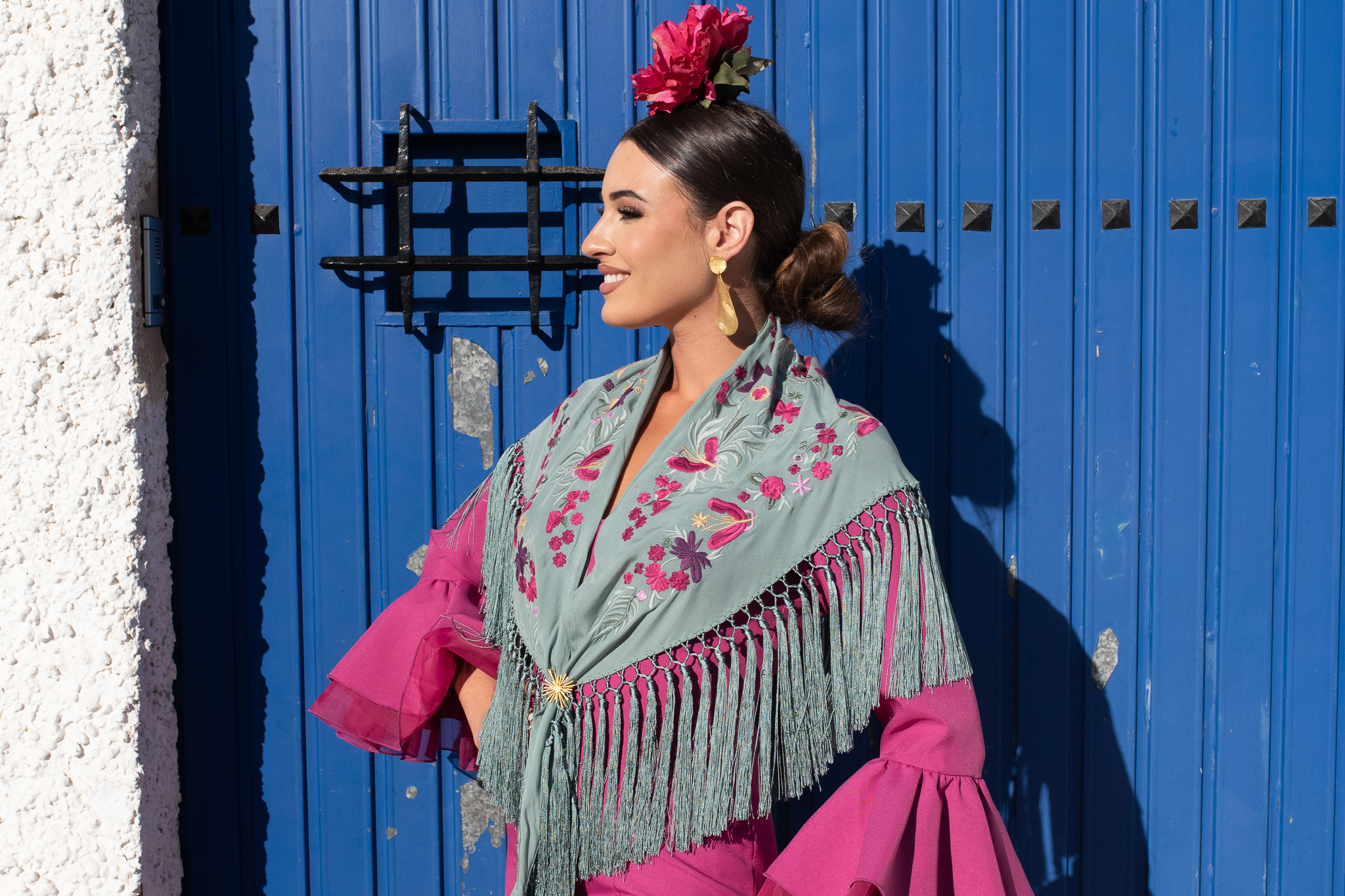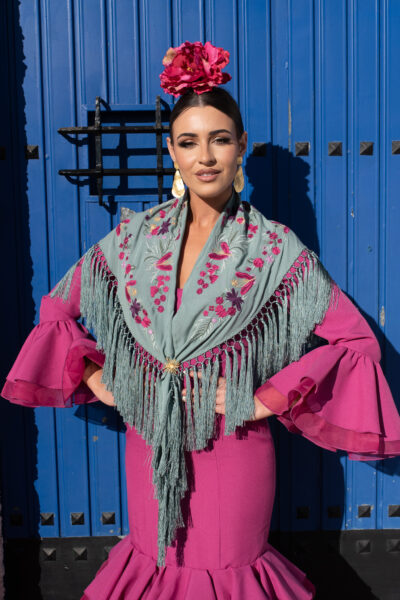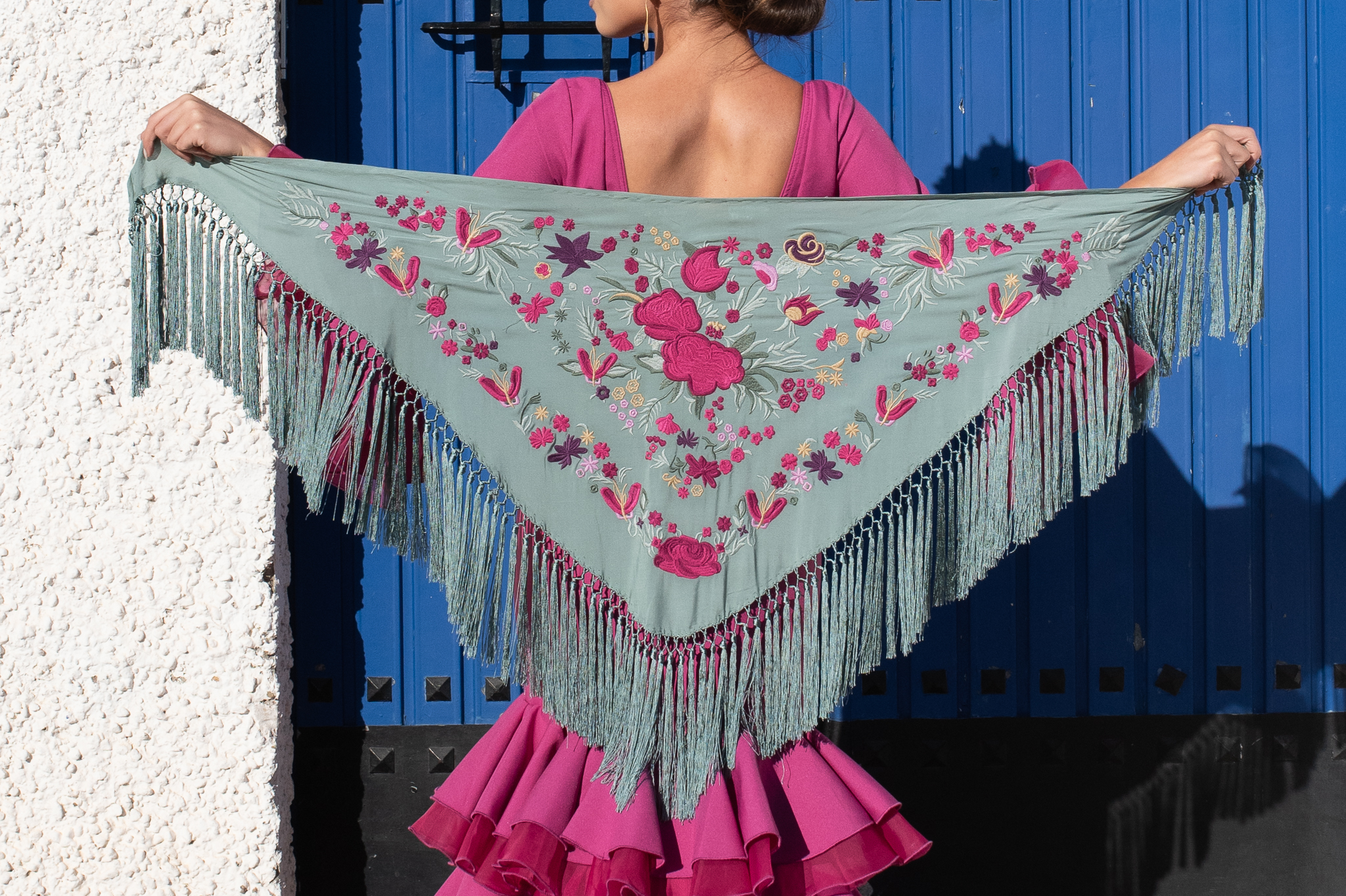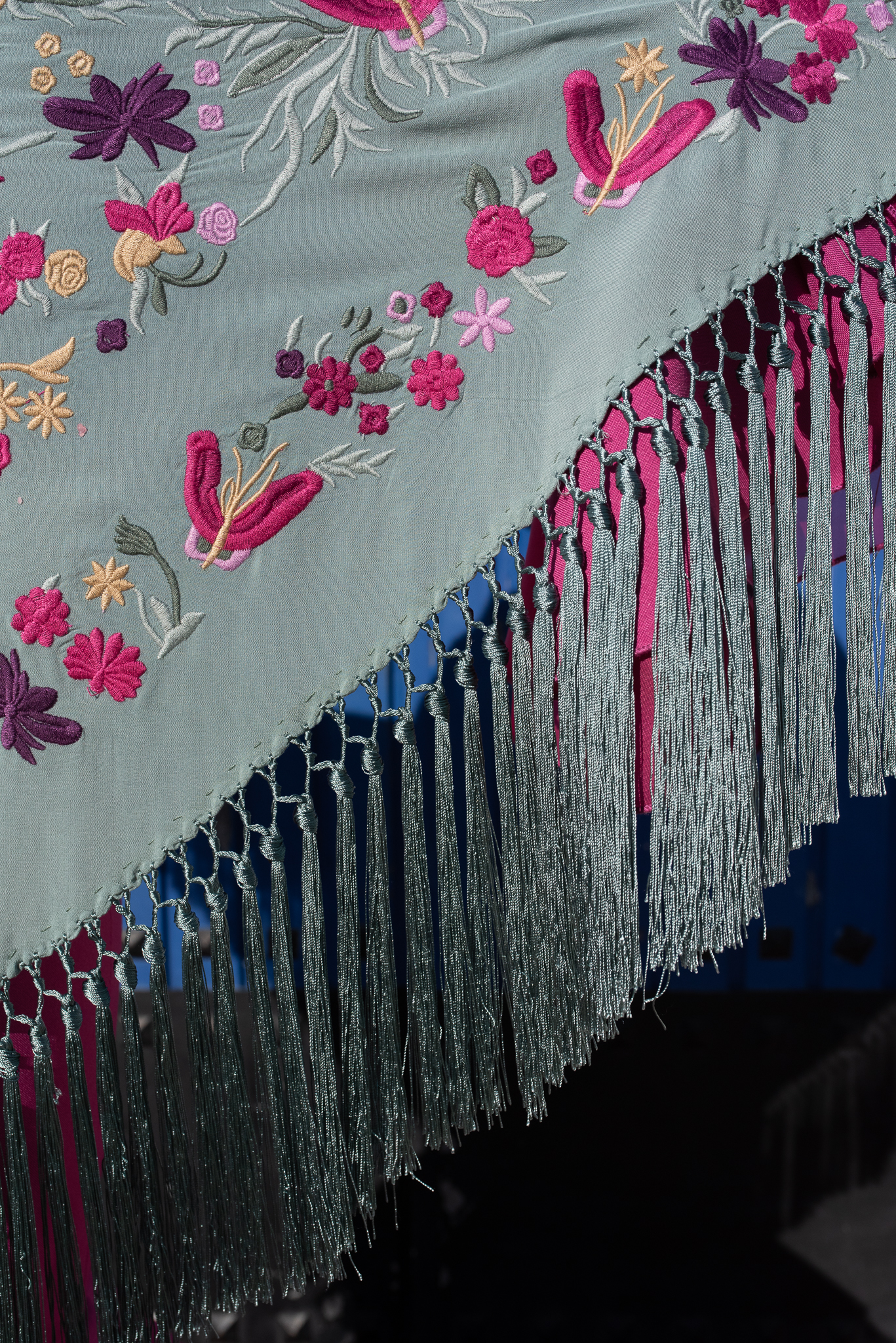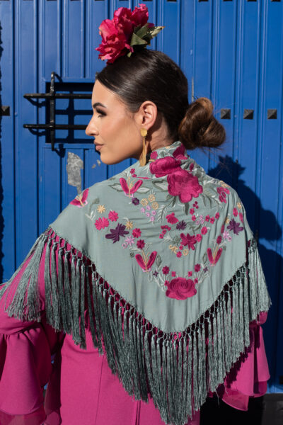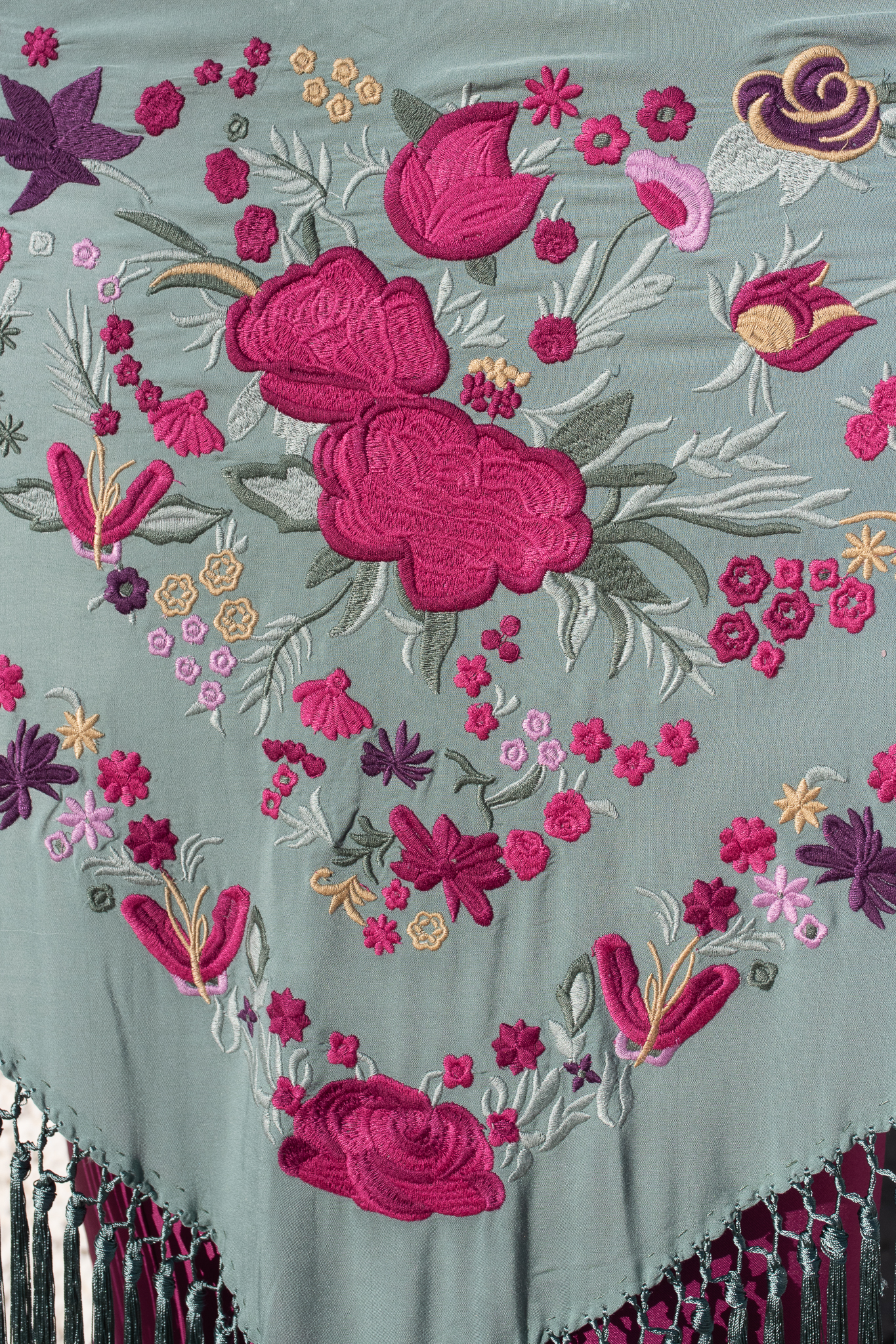 Mantón Gabriela en color verde jade de algodón con bordado multicolor en hilo mate de seda