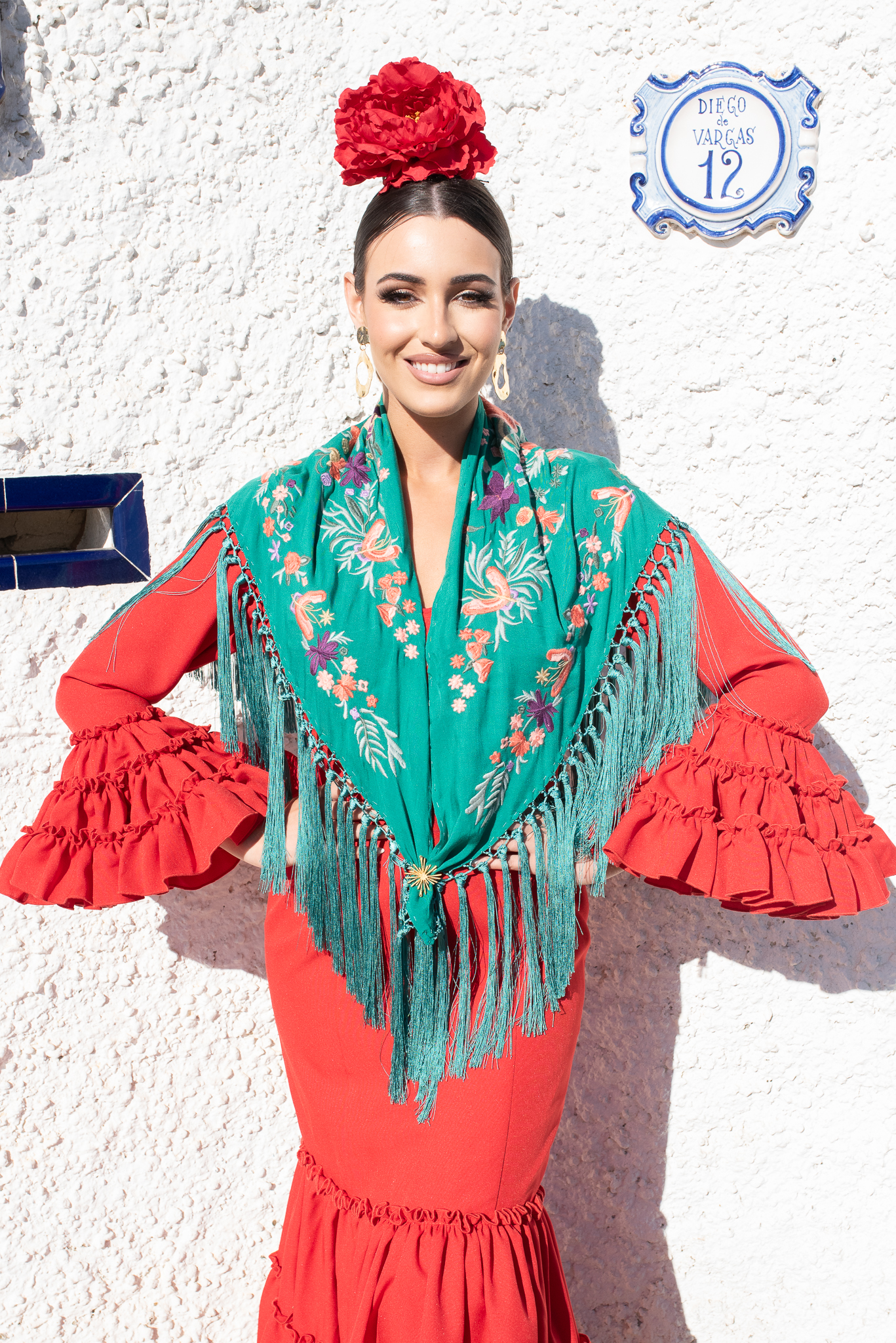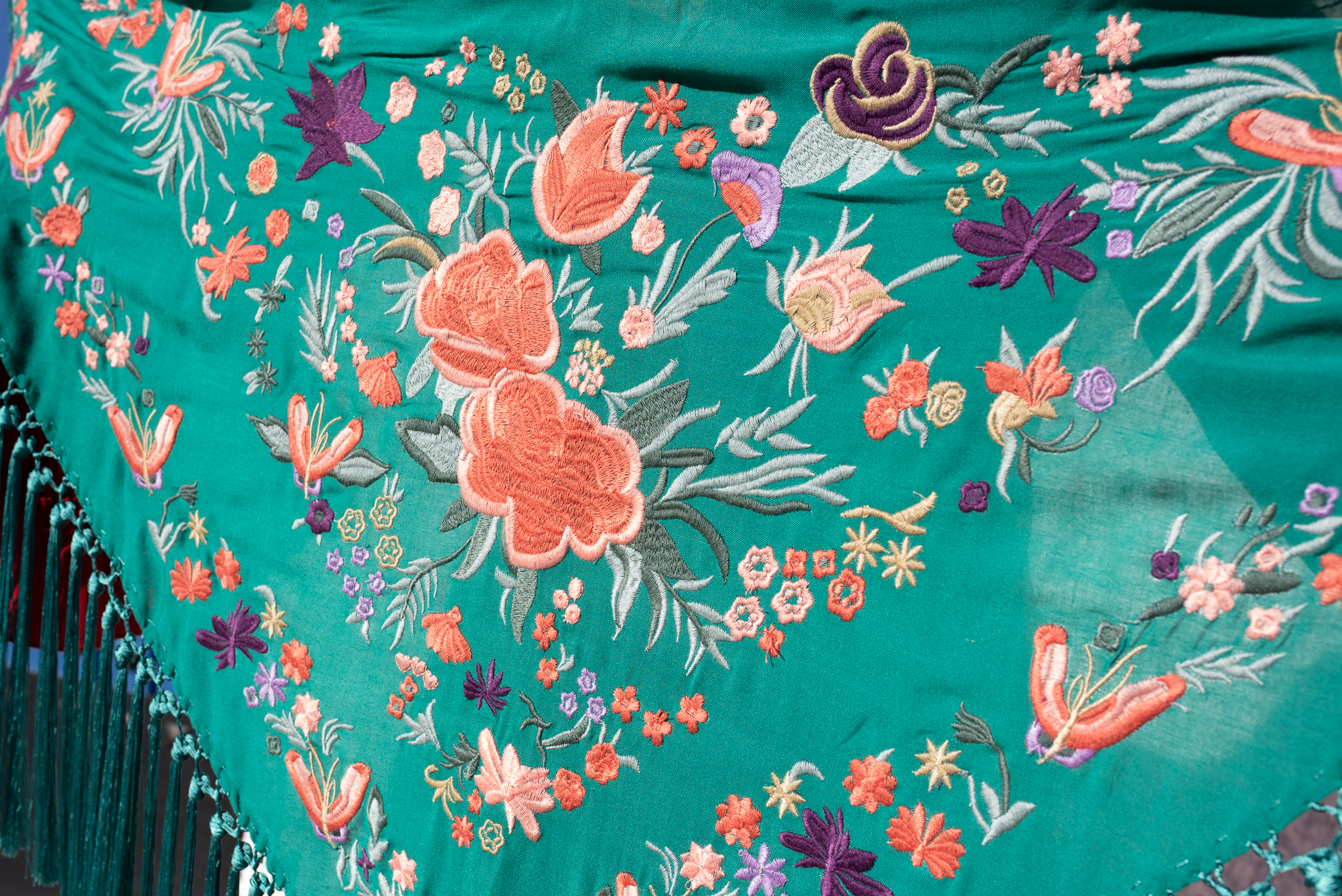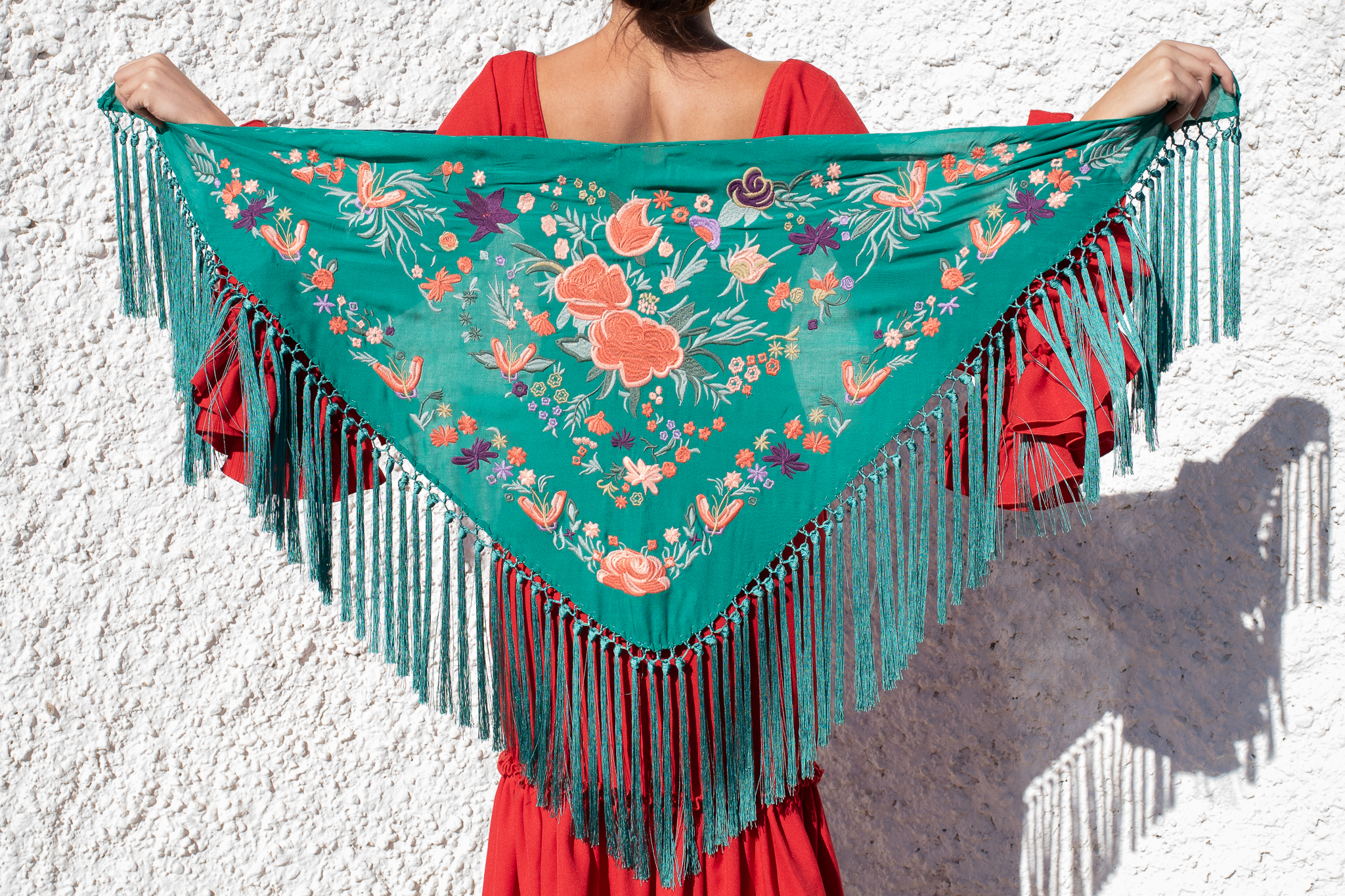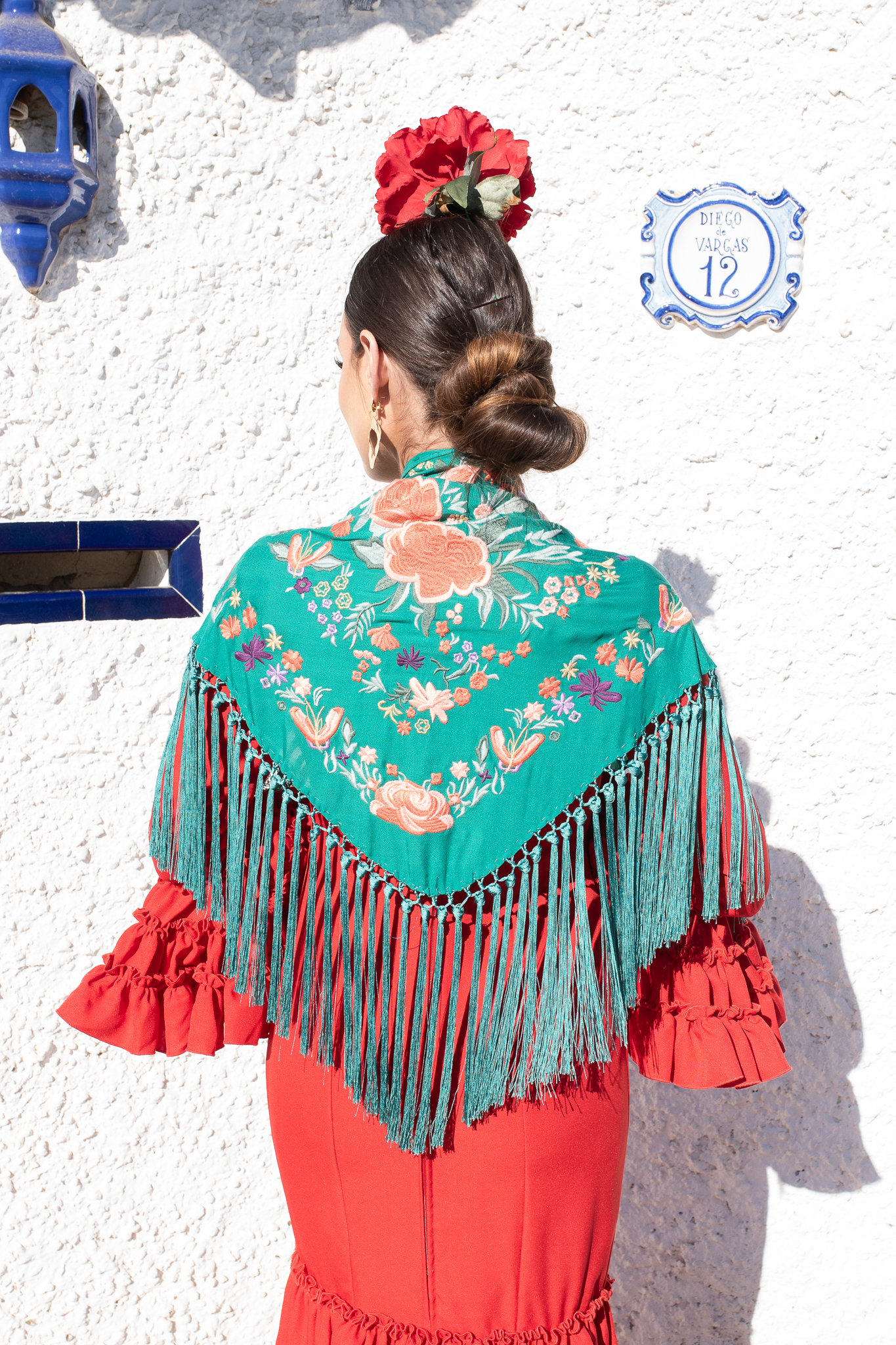 Mantón Gabriela en color verde petróleo de algodón con bordado coral en hilo mate de seda
