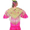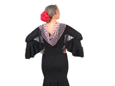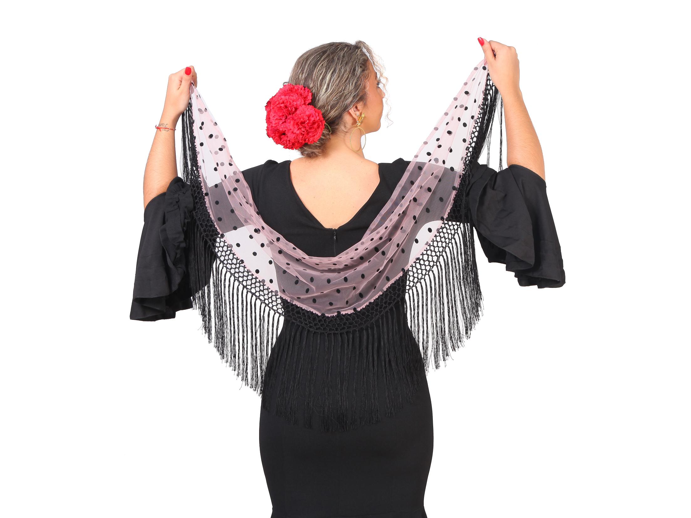 Mantoncillo de plumeti rosa con lunares negros. Medidas: 120x35cm aprox. (Sólo el mantón) más los flecos 25 cm (incluyendo el enrejado). Fabricado artesanalmente en la provincia de Sevilla.