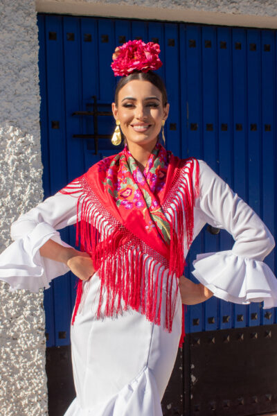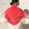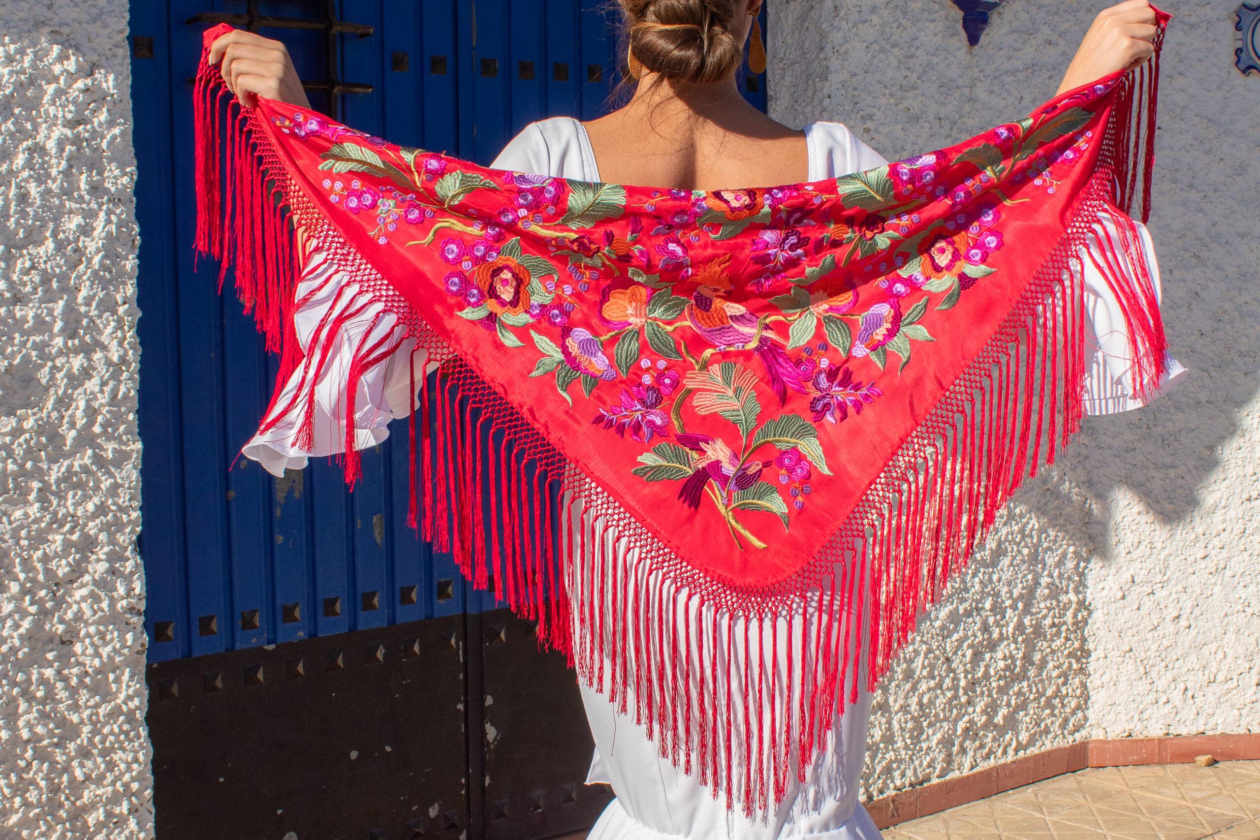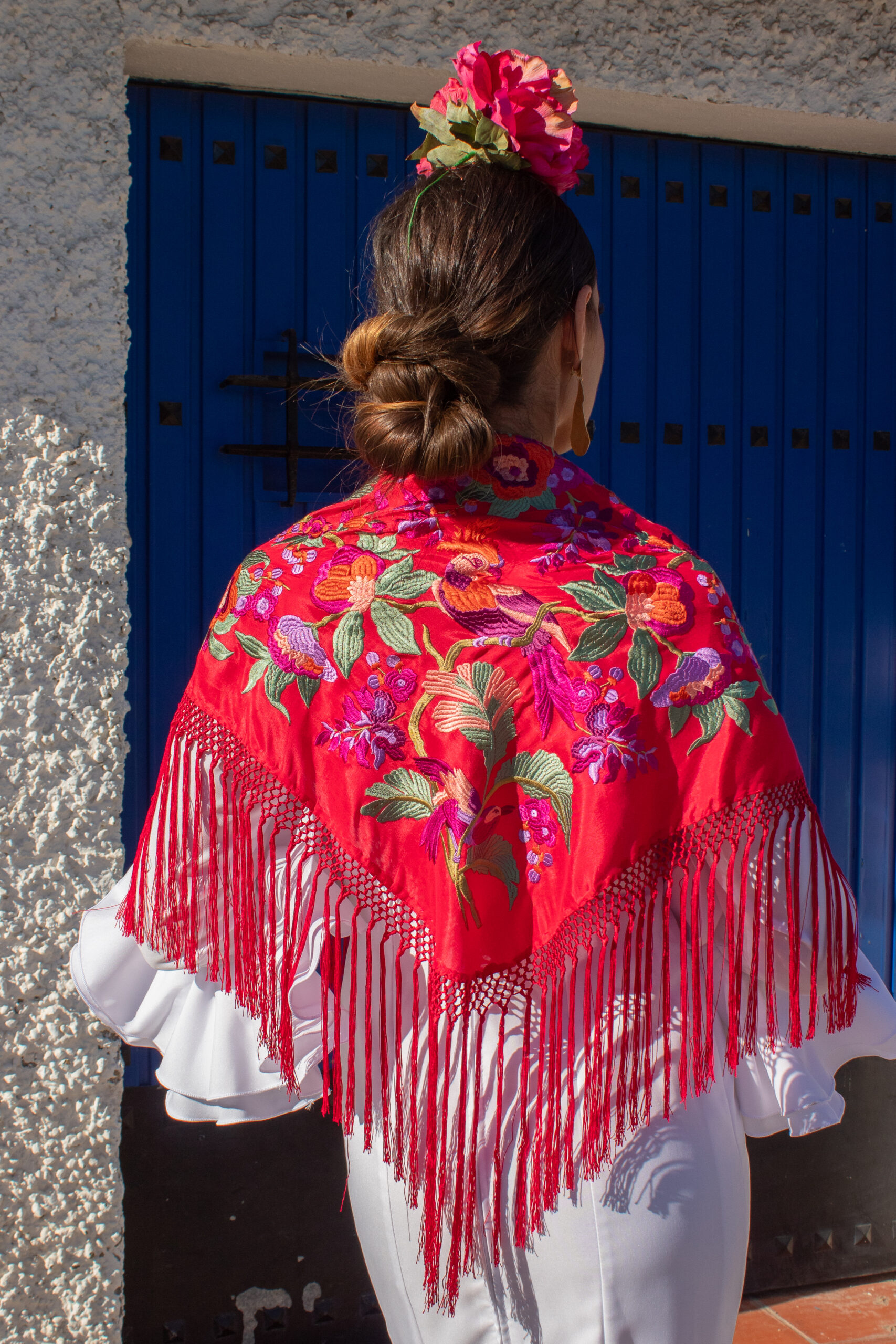 Mantón frambuesa de seda con bordado en hilo de seda multicolor con un espectacular diseño de flores. Enrejado y flecado a mano en seda 100% natural en la provincia de Sevilla.