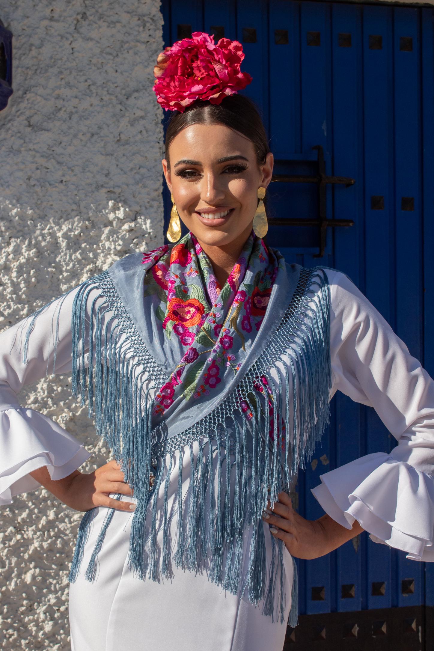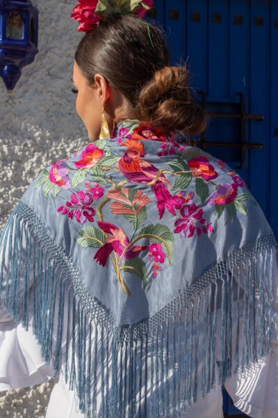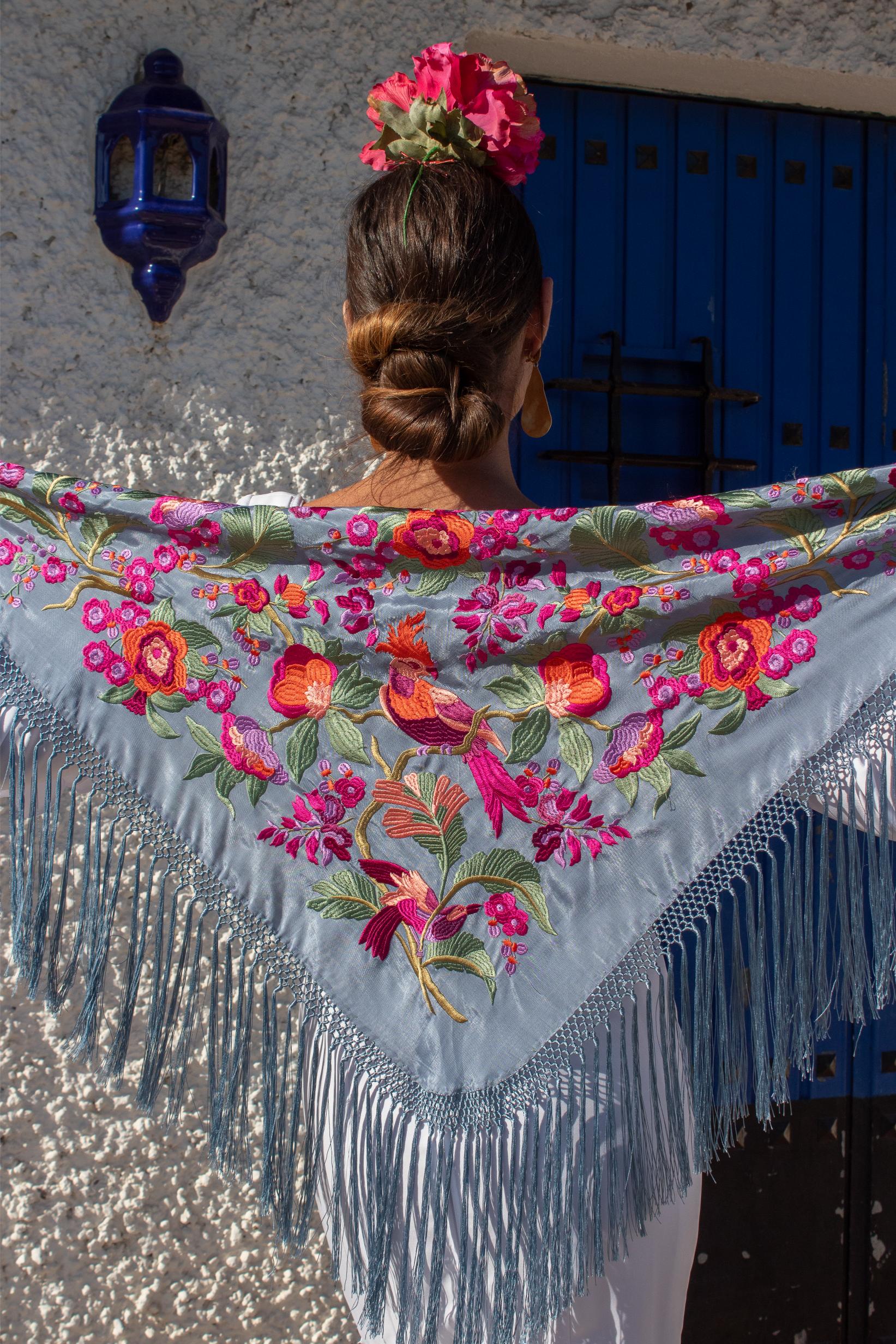 Mantón gris de seda con bordado en hilo de seda multicolor con un espectacular diseño de flores. Enrejado y flecado a mano en seda 100% natural en la provincia de Sevilla.