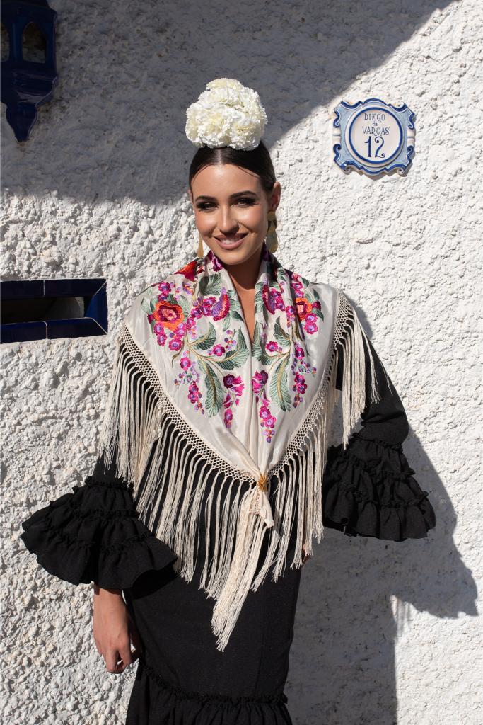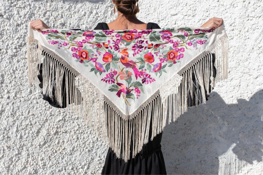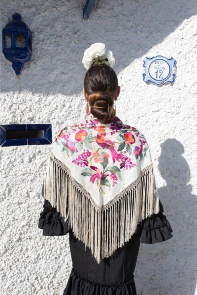 Mantón marfil de seda con bordado en hilo de seda multicolor con un espectacular diseño de flores. Enrejado y flecado a mano en seda 100% natural en la provincia de Sevilla.