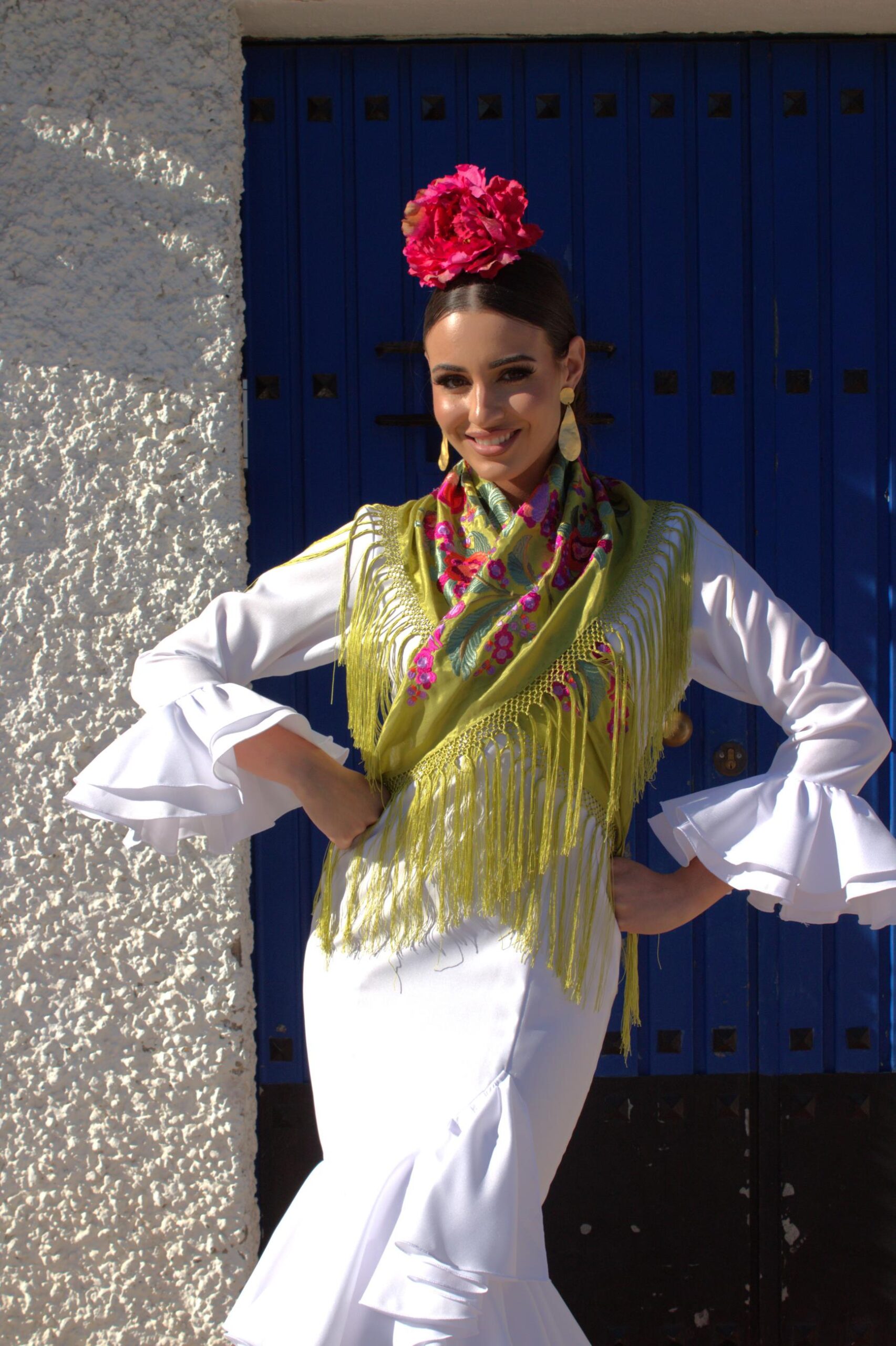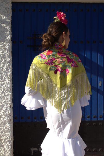 Mantón verde pistacho de seda con bordado en hilo de seda multicolor con un espectacular diseño de flores. Enrejado y flecado a mano en seda 100% natural en la provincia de Sevilla.