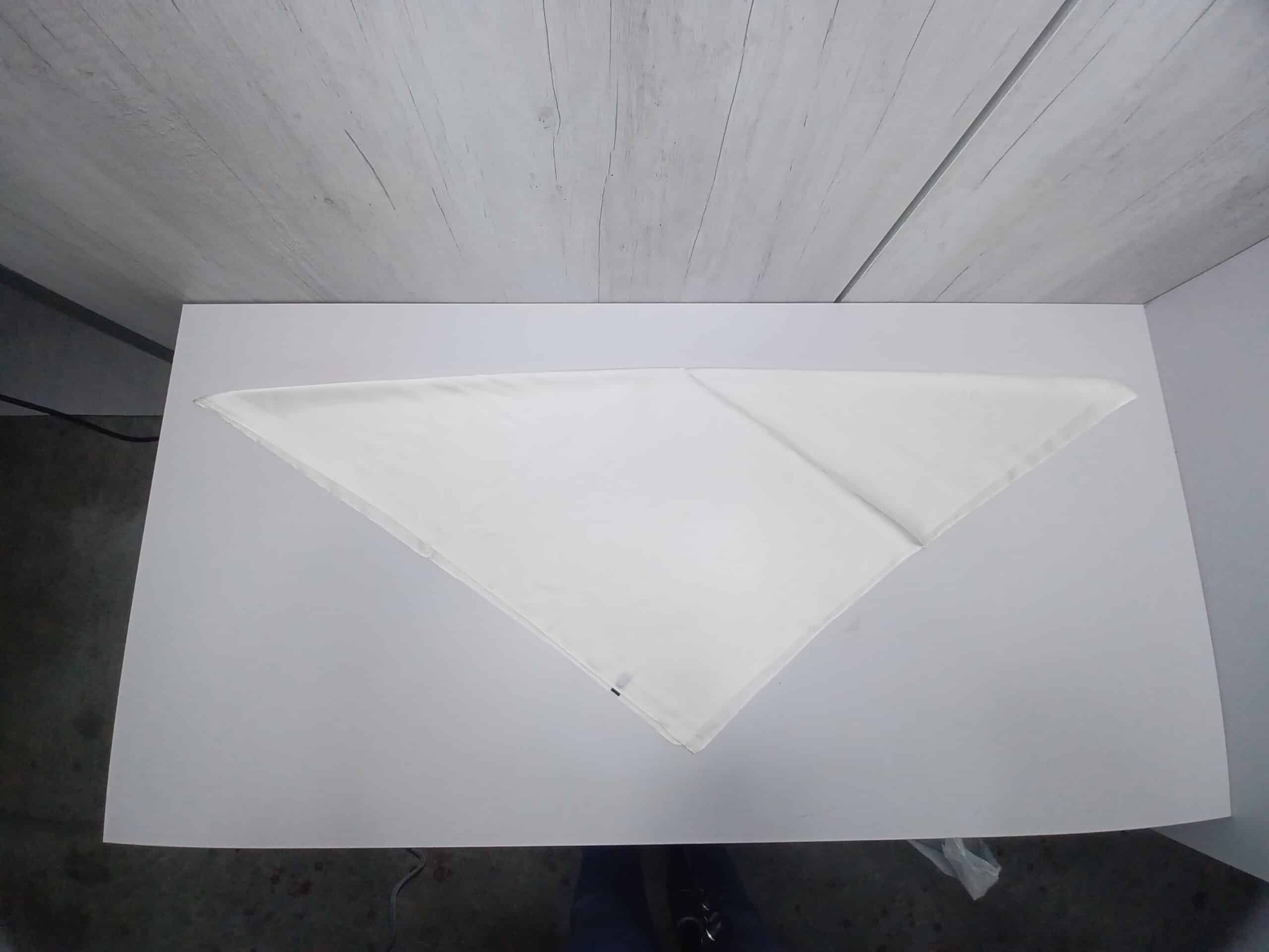Pañuelo rociero liso de color blanco, hecho de 80% tela viscosa y 20% seda.