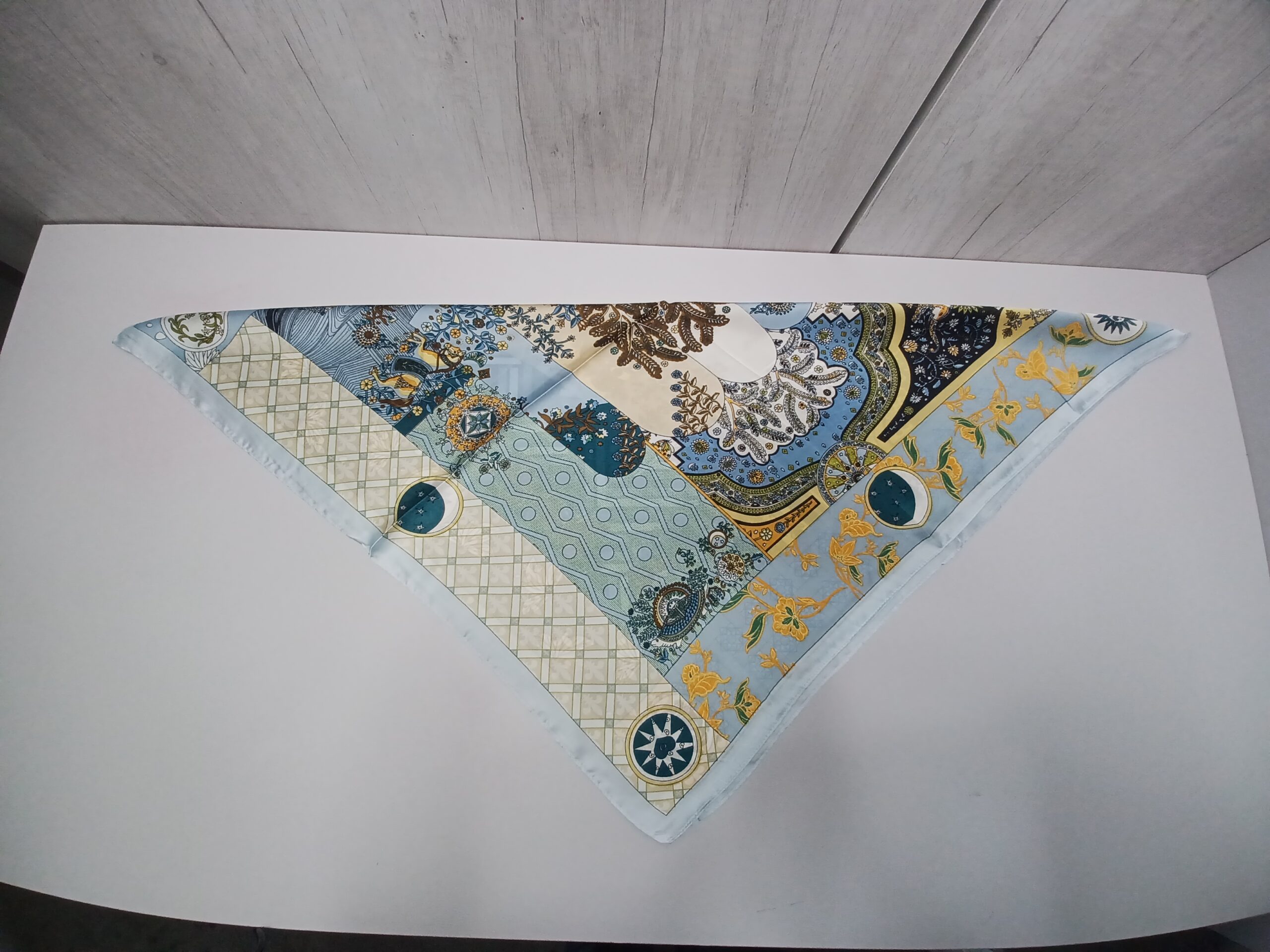 Pañuelo rociero liso de color Cian estampado con dibujos, hecho de 80% tela viscosa y 20% seda.