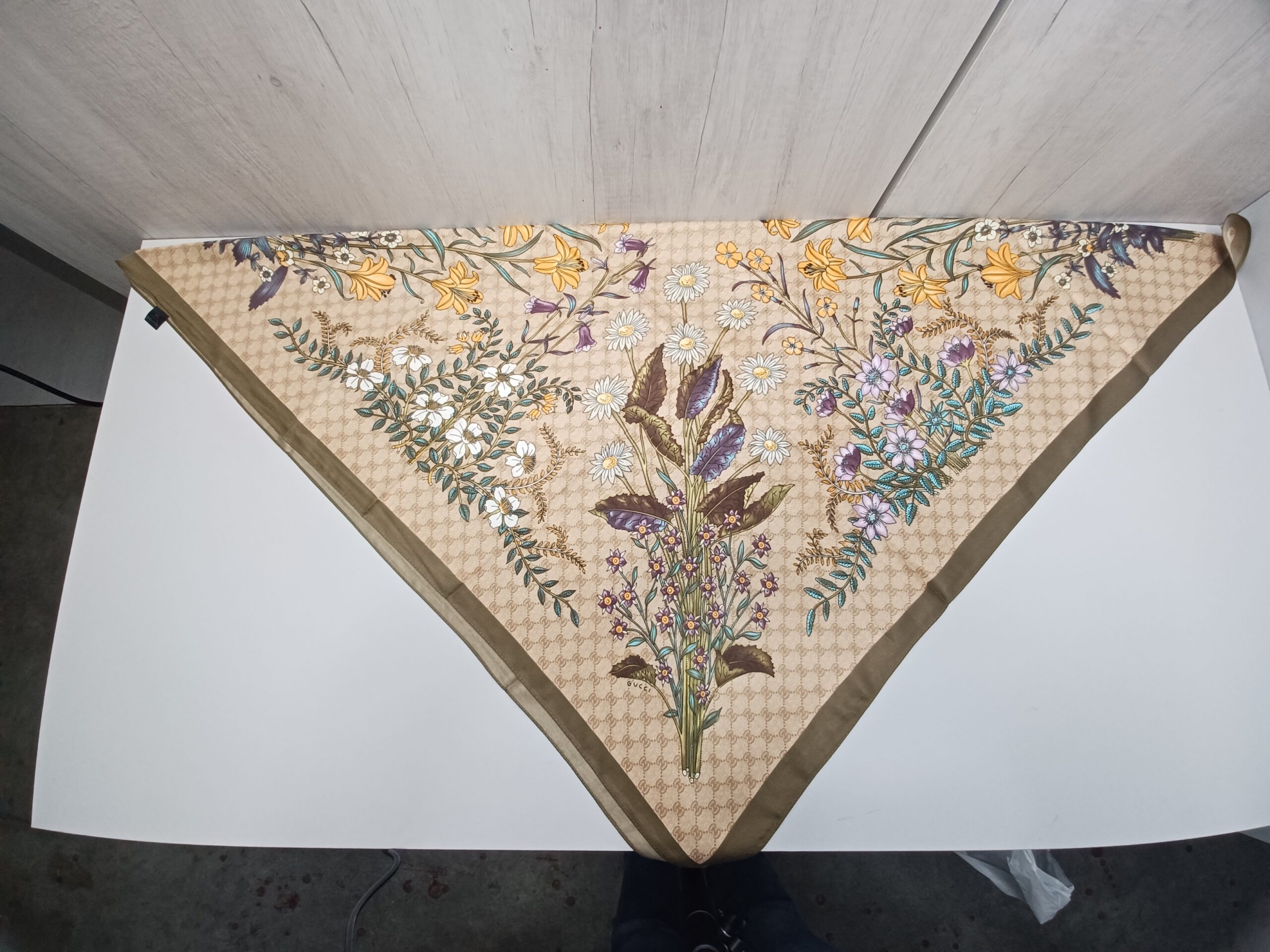 Pañuelo rociero grande de color Verde-Amarillento estampado con flores, hecho de 100% polyester.