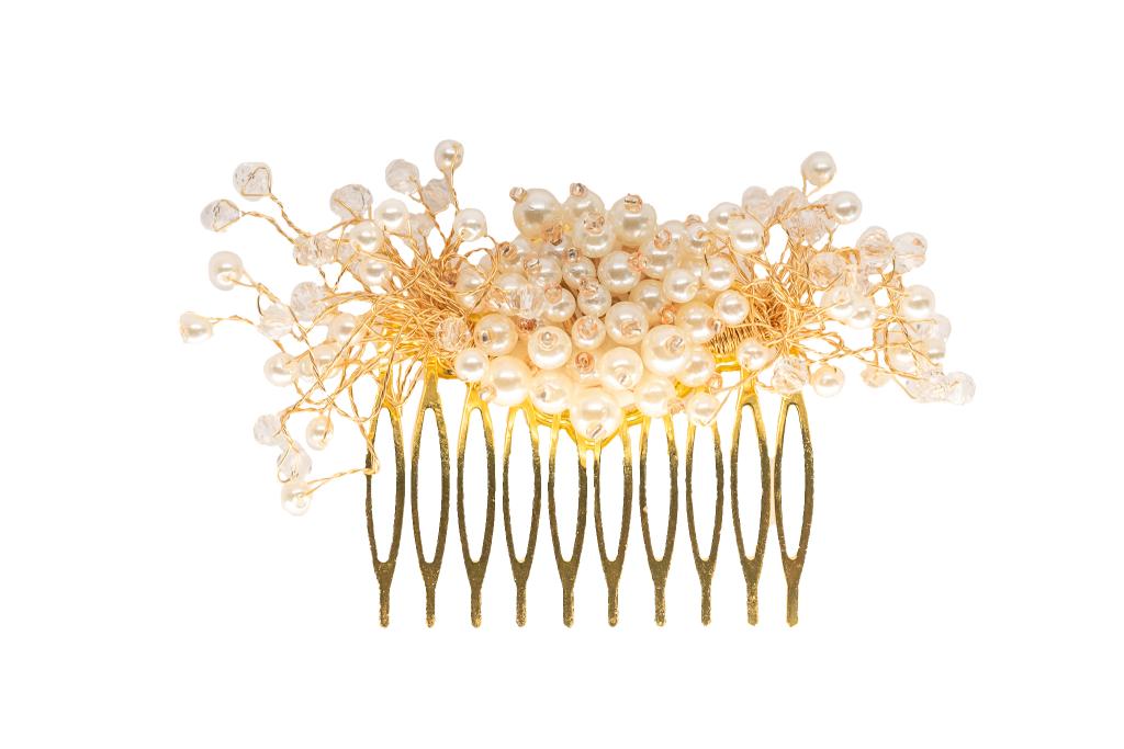 Peinecillo de flamenca con aplique cristal en blanco y perlitas. Medidas ancho x largo 80 x 50 mm (incluye horquilla). Fabricado artesanalmente en la provincia de Sevilla.