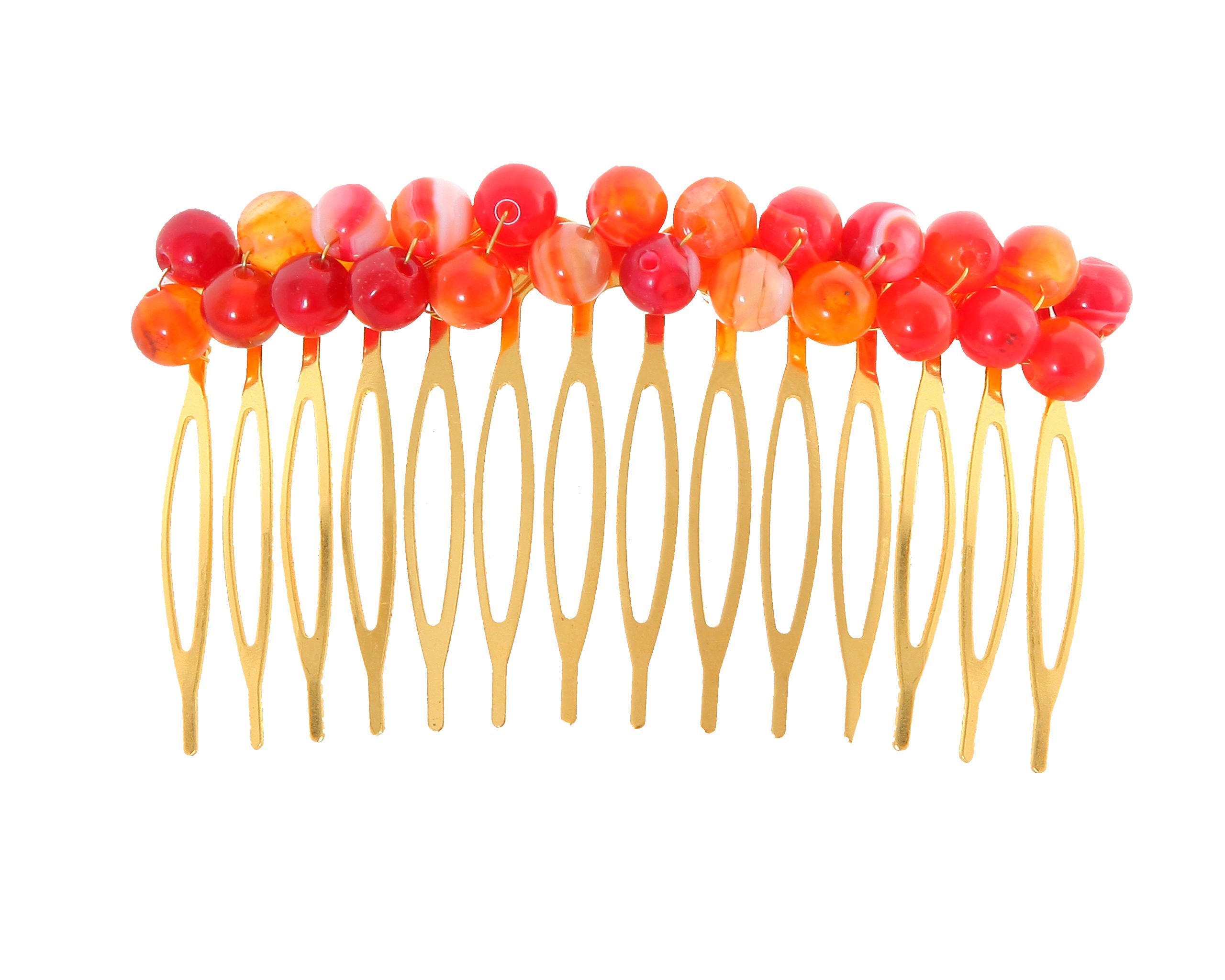 Peinecillo con bolas de piedra Ágata en tonos naranjas. Medidas aproximadas ancho x largo, 80x45mm. Fabricado artesanalmente en la provincia de Sevilla.