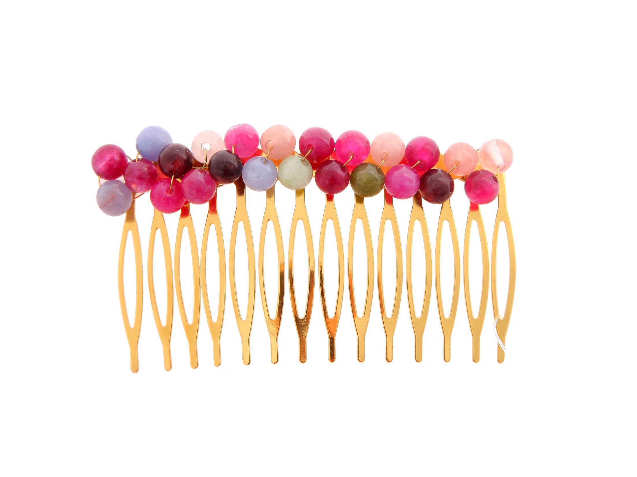 Peinecillo con bolas de piedra Ágata multipastel. Medidas aproximadas ancho x largo, 45x55mm. Fabricado artesanalmente en la provincia de Sevilla.