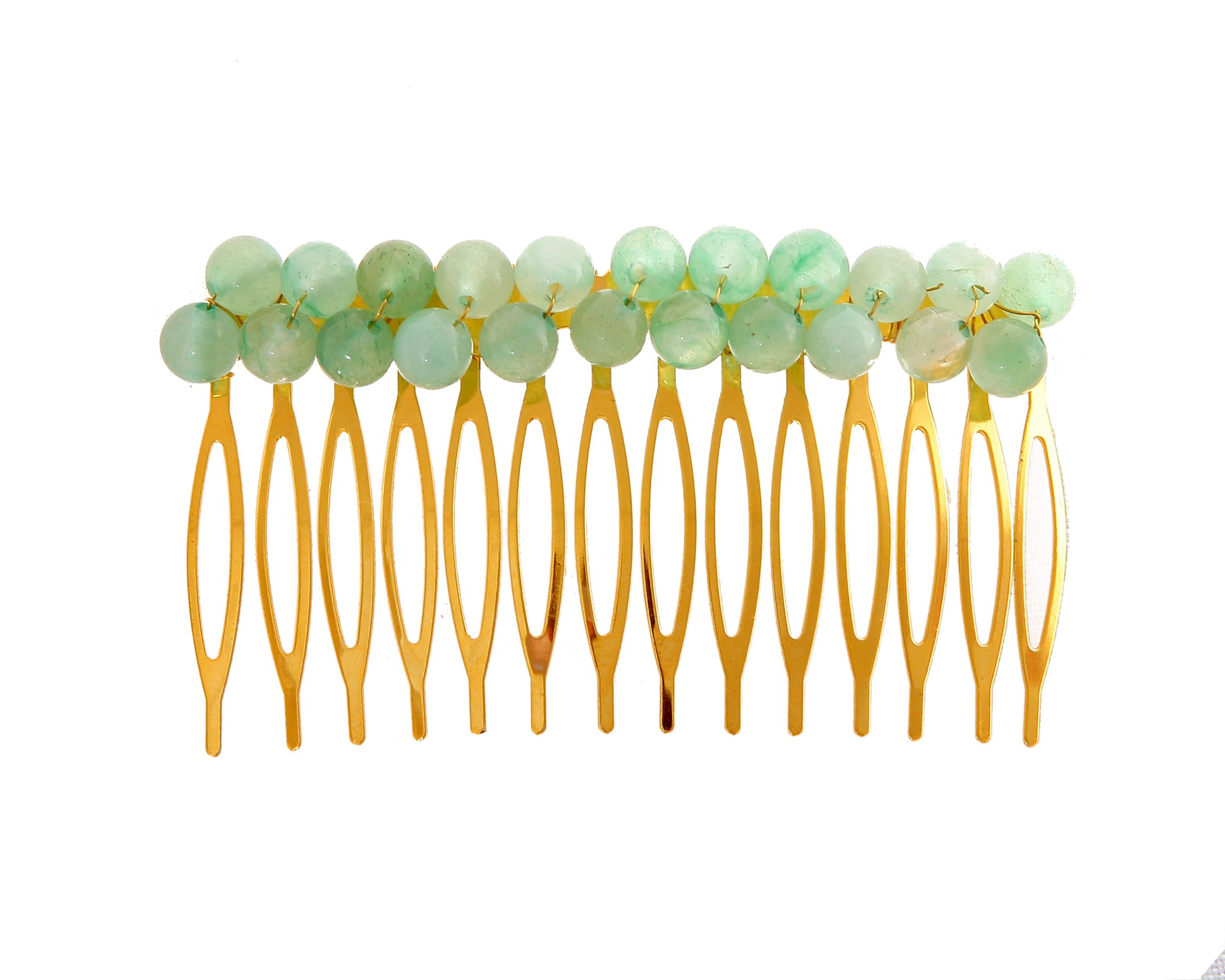 Peinecillo con bolas de piedra Ágata verde jabonoso. Medidas aproximadas ancho x largo, 80x45mm. Fabricado artesanalmente en la provincia de Sevilla.