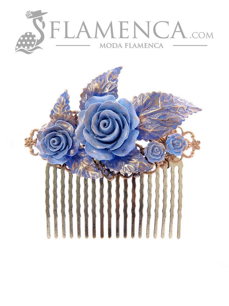 Peinecillo de flamenca de color azul ducado con reflejos oro, detalle floral, peines metálicos que facilitan el agarre al pelo de la flamenca, y con medidas de: 80 x 76 mm. Se recomiendan 2 para un look más completo. Elaborado artesanalmente en Sevilla.