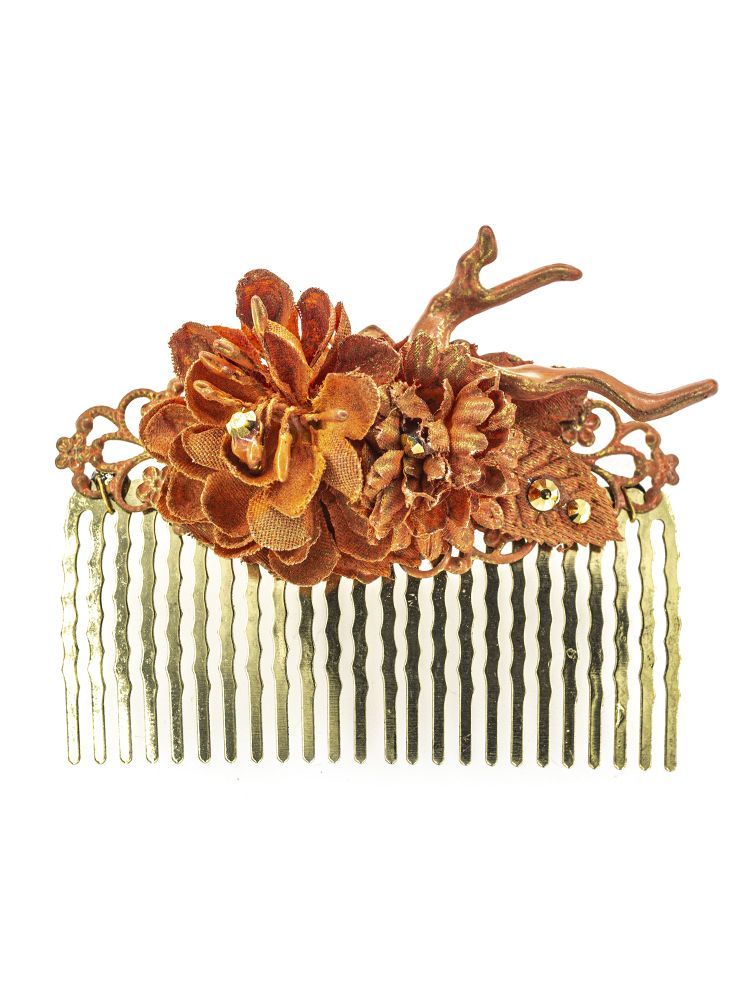 Peinecillo de flamenca con detalle coral y flores de tela coral con reflejos dorado, peines metálicos que facilitan el agarre al pelo de la flamenca, y con medidas de: 80 x 70 mm. Elaborado artesanalmente en Sevilla.