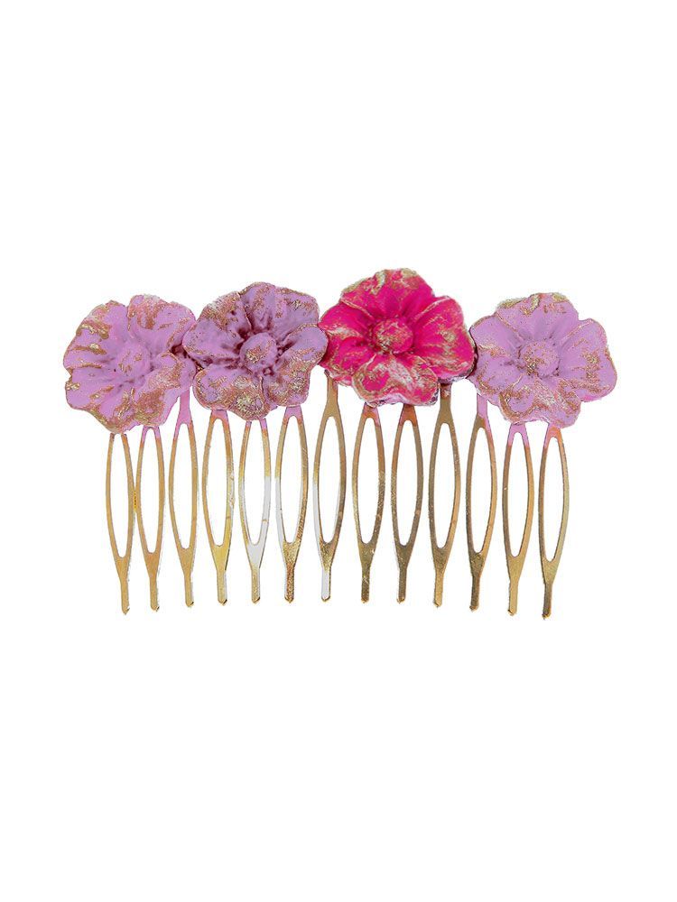 Peinecillo de flamenca en porcelana en tonos morados degradé, peines metálicos que facilitan el agarre al pelo de la flamenca, y con medidas de: 70 x 40 mm, fornitura metálica. Fabricado artesanalmente en Sevilla.
