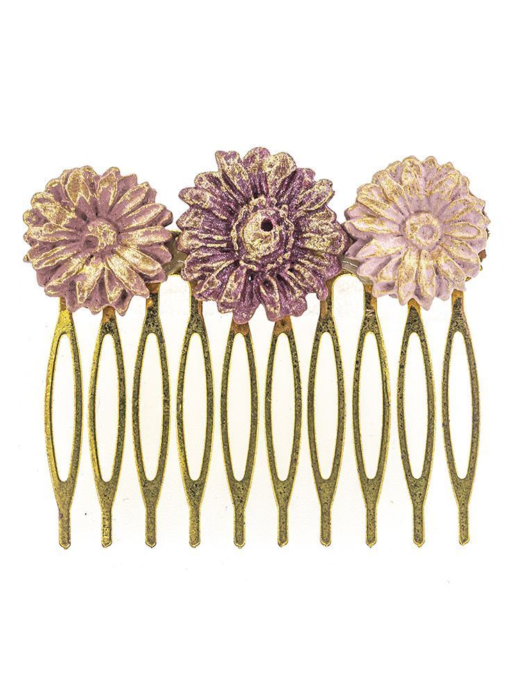 Peinecillo de flamenca de porcelana, en tonos morados degradé con reflejos dorados, con base metálica, facilitando un buen agarre al pelo de la flamenca, con unas medidas de 55 x 50 mm. Las flores están elaboradas delicadamente a mano con porcelana fría. Fabricado artesanalmente en Sevilla.