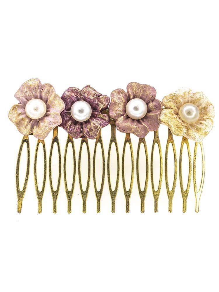 Peinecillo de flamenca en porcelana en tonos maquillaje degradé con reflejos dorados, peines metálicos que facilitan el agarre al pelo de la flamenca, y con medidas de: 70 x 40 mm, fornitura metálica. Fabricado artesanalmente en Sevilla.