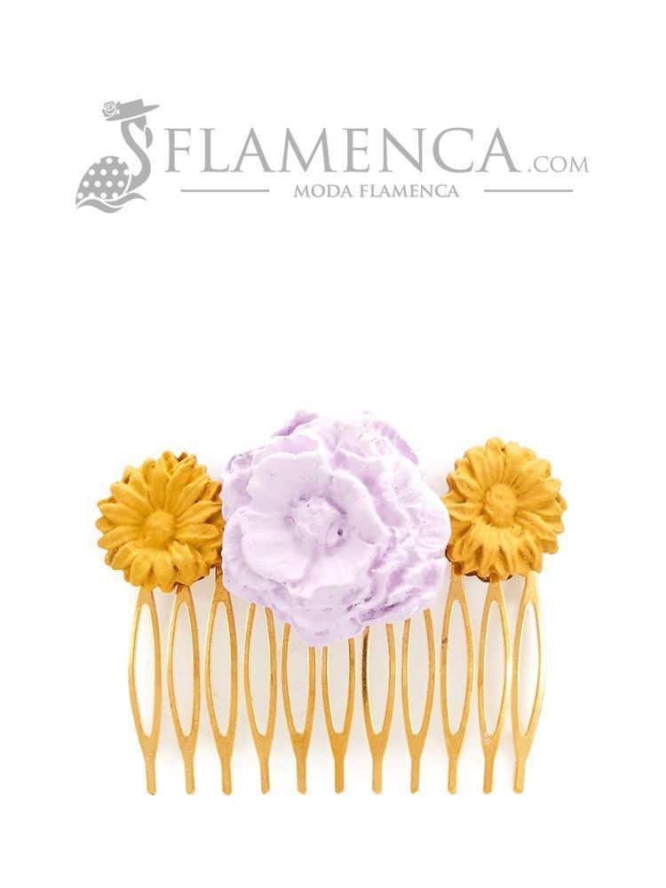 Peinecillo de flamenca de porcelana, en color malva y mostaza , con base metálica, facilitando un buen agarre al pelo de la flamenca, con unas medidas de 65 x 57 mm. Para un look más completo, se recomienda usar dos peinecillos. Las flores están elaboradas delicadamente a mano con porcelana fría. Fabricado artesanalmente en Sevilla.
