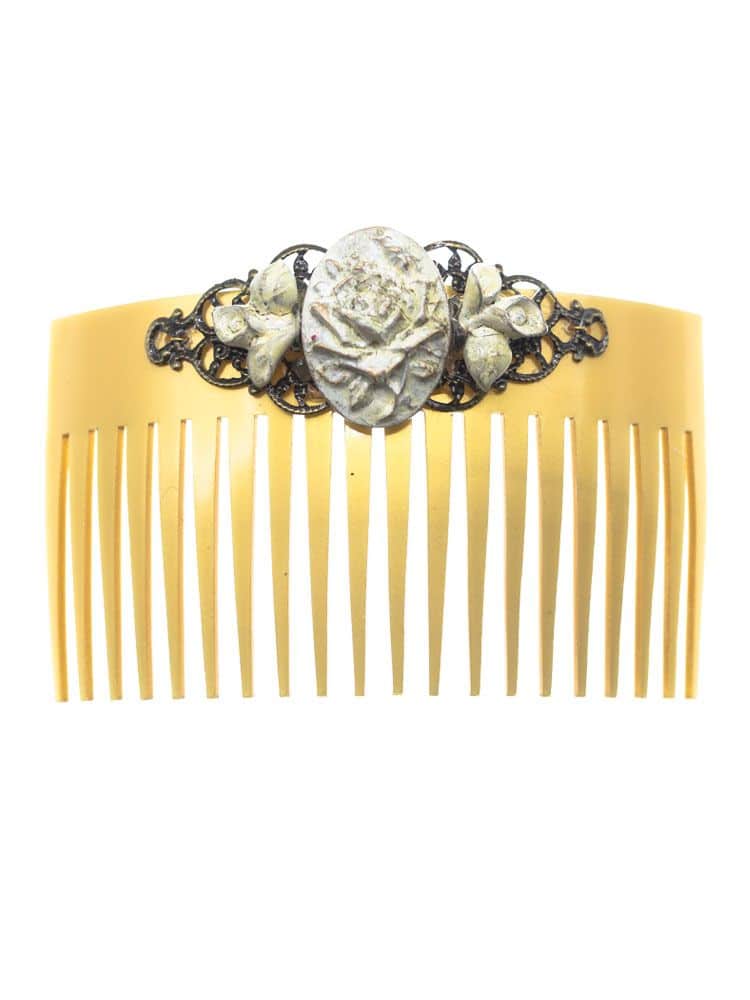 Peinecillo de flamenca de resina blanco con reflejos dorados, peines de acetato que facilitan el agarre al pelo de la flamenca, y con medidas de: 90 x 55 mm. Se recomiendan 2 para un look más completo. Elaborado artesanalmente en Sevilla.