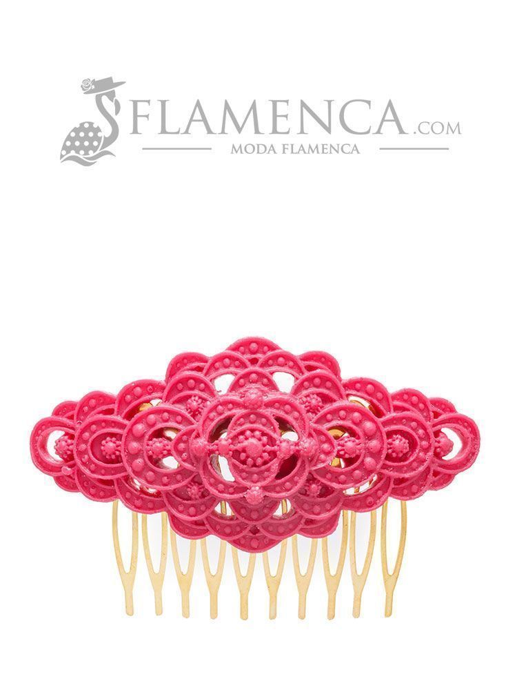 Peinecillo de flamenca, en color buganvilla, de filigrana, con base metálica, facilitando un buen agarre al pelo de la flamenca, con unas medidas de 80 x 38 mm. Para un look más completo, se recomienda usar dos peinecillos. Fabricado artesanalmente en Sevilla.