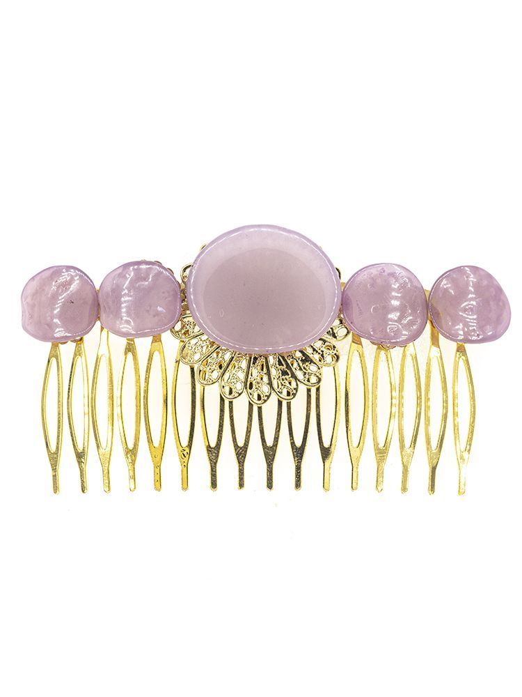 Peinecillo de flamenca de resina cristal, en color malva, con base metálica, facilitando un buen agarre al pelo de la flamenca, con unas medidas de 95 x 50 mm. Para un look más completo, se recomienda usar dos peinecillos. Fabricado artesanalmente en Sevilla.
