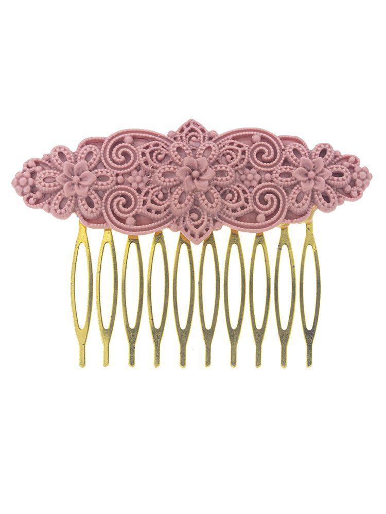 Peinecillo de flamenca, en color maquillaje, tallado, con estilo floral, base metálica, facilitando un buen agarre al pelo de la flamenca, con unas medidas de 78 x 28 mm. Fabricado artesanalmente en Sevilla.