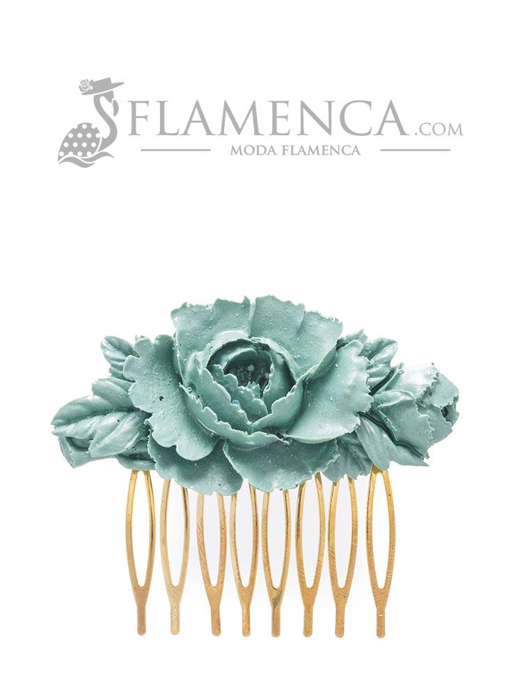 Peinecillo de flamenca, en color verde agua antiguo, estilo floral, con base metálica, facilitando un buen agarre al pelo de la flamenca, con unas medidas de 30 x 64 mm. Para un look más completo, se recomienda usar dos peinecillos. Fabricado artesanalmente en Sevilla.