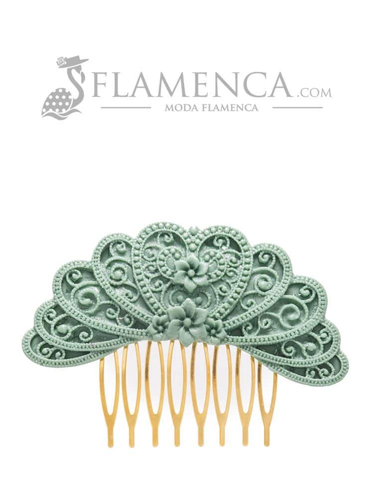 Peinecillo de flamenca, en color verde agua antiguo, tallado, con base metálica, facilitando un buen agarre al pelo de la flamenca, con unas medidas de 77 x 35 mm. Para un look más completo, se recomienda usar dos peinecillos. Fabricado artesanalmente en Sevilla.
