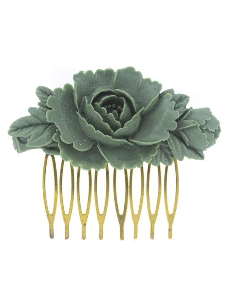Peinecillo de flamenca, en color verde caki, de estilo floral, con base metálica, facilitando un buen agarre al pelo de la flamenca, con unas mediadas de 65 x 30 mm. Fabricado artesanalmente en Sevilla.