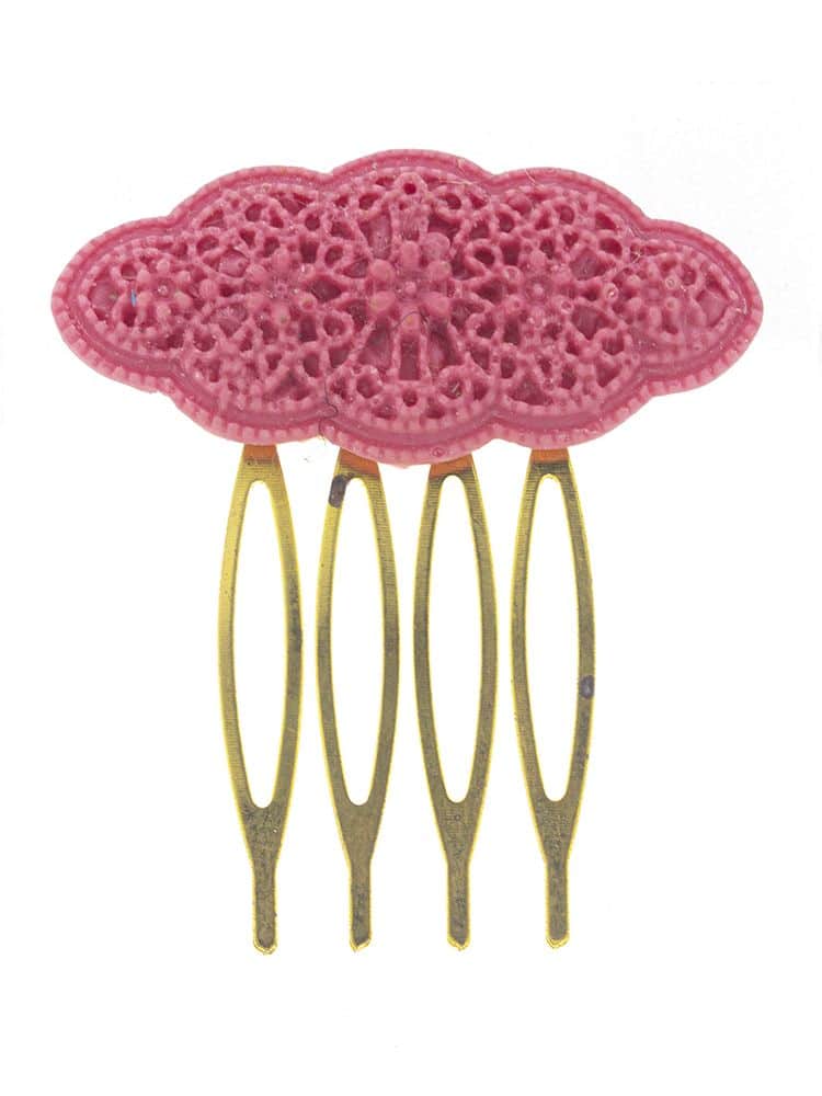 Peinecillo de flamenca en forma de abanico de resina ,color frambuesa, peines metálicos que facilitan el agarre al pelo de la flamenca, y con medidas de 40 x 20 mm. Elaborado artesanalmente en Sevilla.