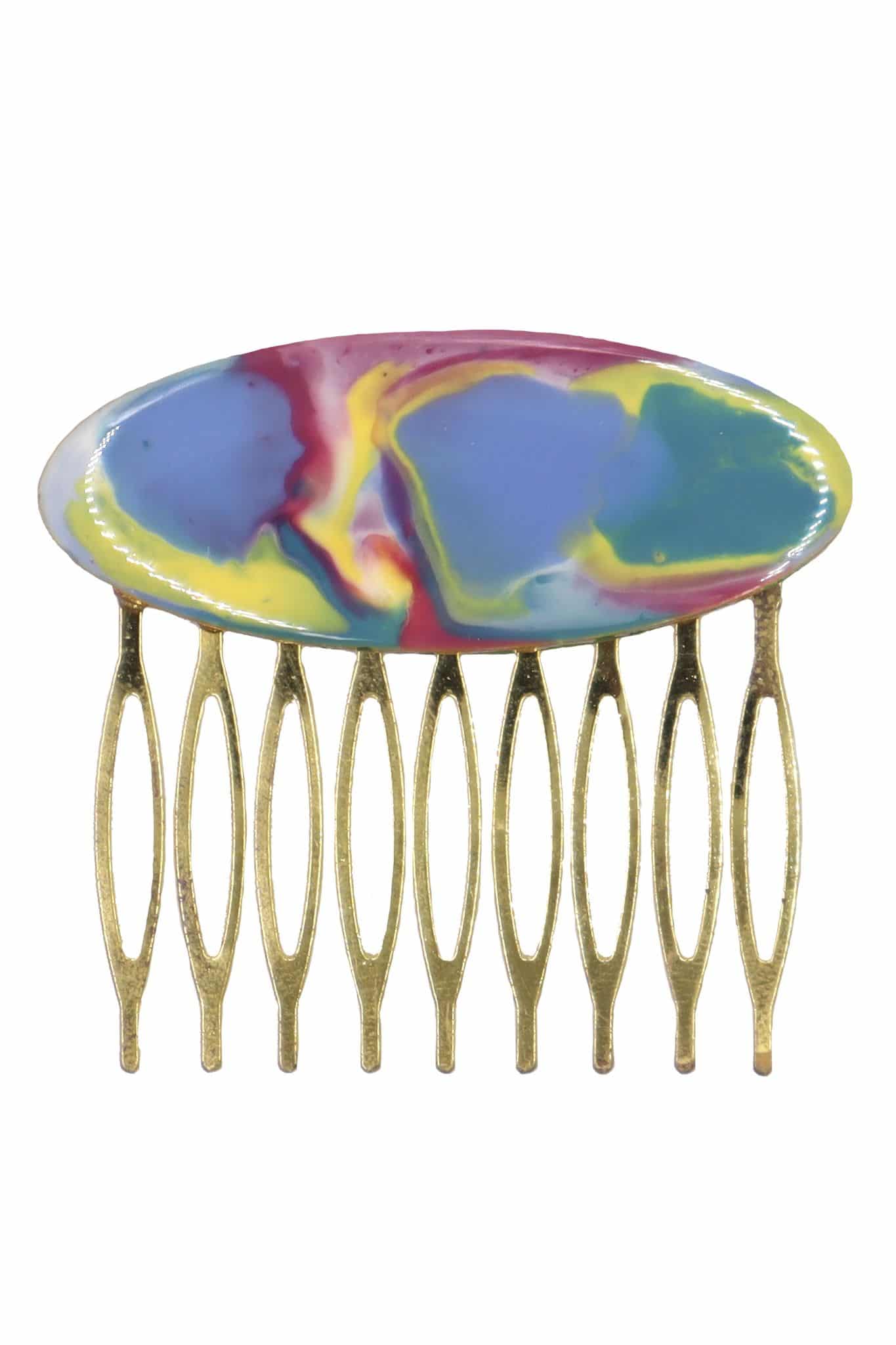 Peinecillo de flamenca mediano esmaltado acuarela multicolor cardenal, azul, verde y amarillo degradado. Medida 55×22 mm (sin peine). Fabricado artesanalmente en la provincia de Sevilla.