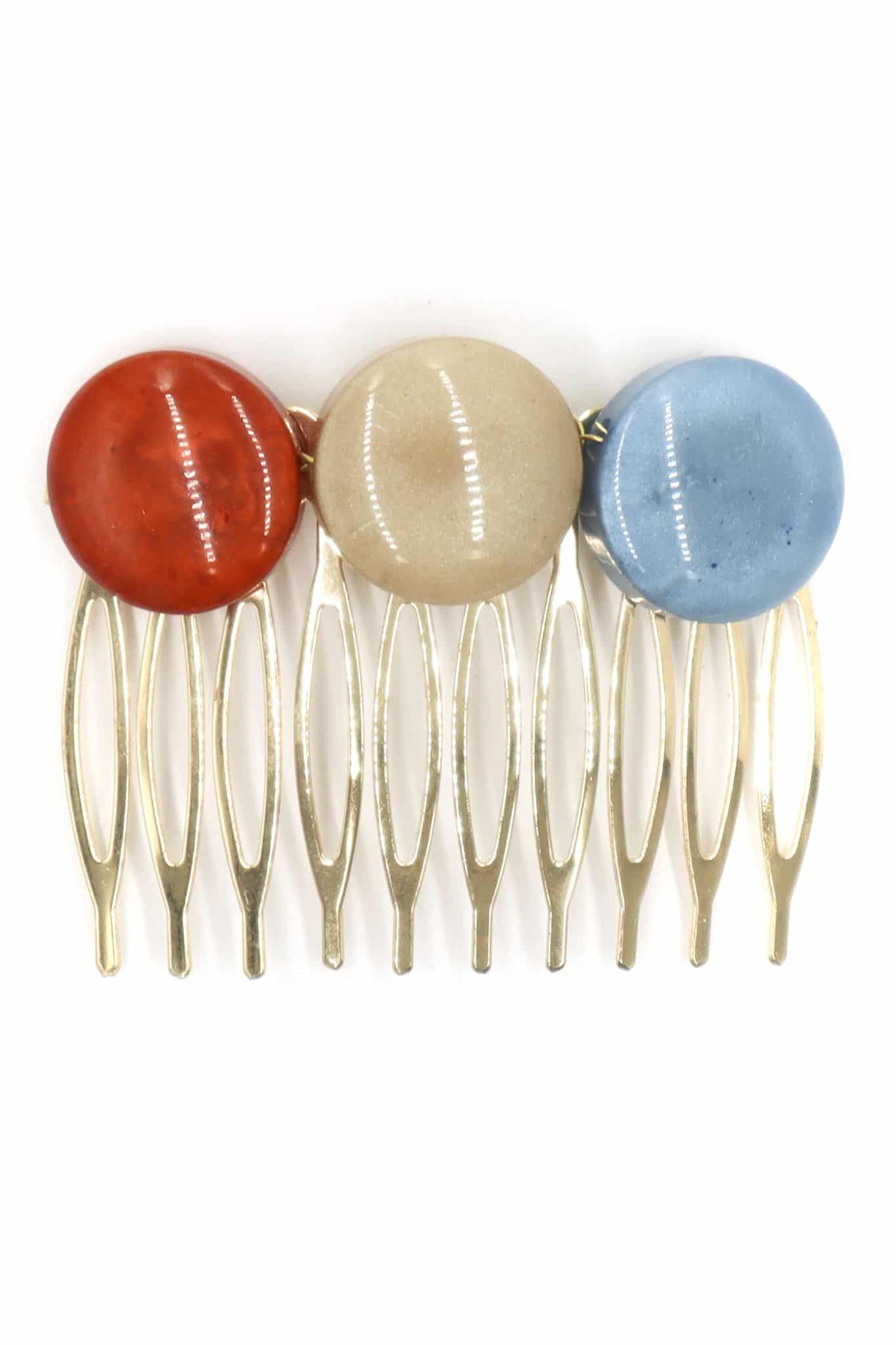 Peinecillo de flamenca mediano piedras nácar color beige, coral y azul azafata. Medida 55×18 mm (sin peinecillo). Fabricado artesanalmente en la provincia de Sevilla.