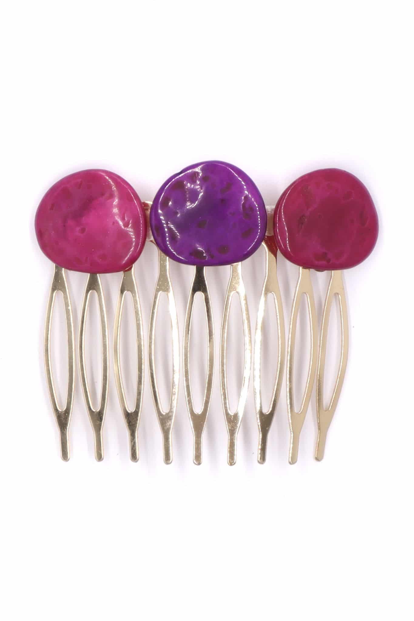 Peinecillo de flamenca mediano piedras nácar color buganvilla y morado. Medida 50×15 mm (sin peinecillo). Fabricado artesanalmente en la provincia de Sevilla.