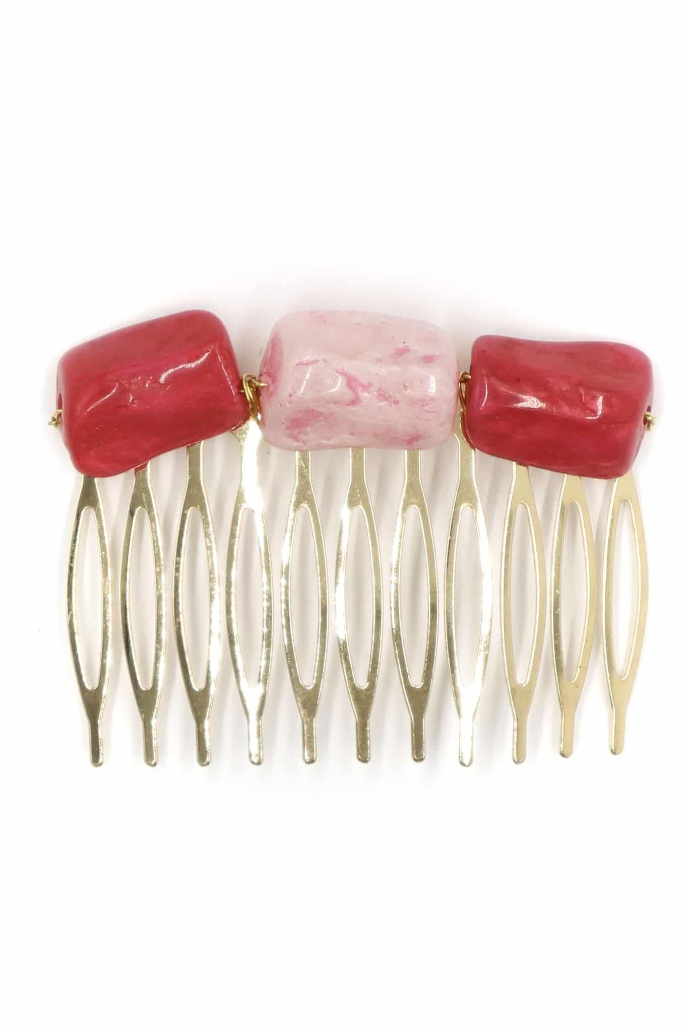 Peinecillo de flamenca mediano piedras nácar color fresa y rosa bebé. Medida 60×15 mm (sin peinecillo). Fabricado artesanalmente en la provincia de Sevilla.