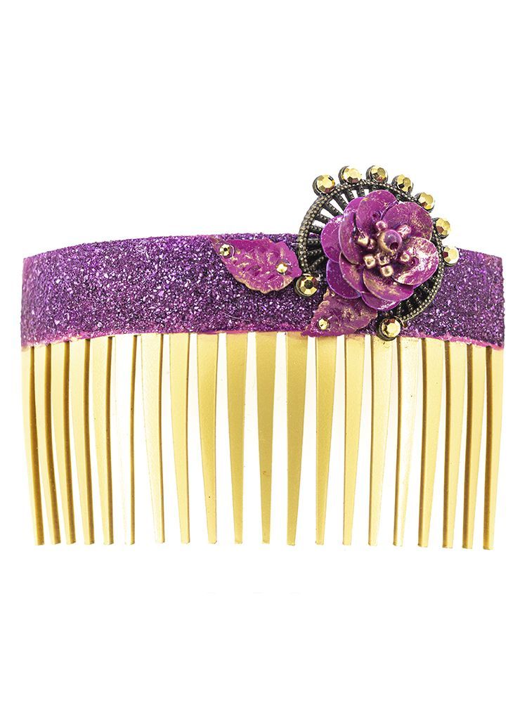 Peinecillo de flamenca morado con polvo de nácar, piedras, fornitura metálica con reflejos dorados y peines de acetato que facilitan el agarre al pelo de la flamenca y con medidas de: 80 x 50 mm. Elaborado artesanalmente en Sevilla.