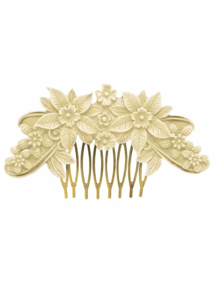 Peinecillo de flamenca de resina en forma de detalle floral color marfil. Peines metálicos en dorado que facilitan el agarre al pelo de la flamenca y con medidas de: 90 x 50 mm. Se recomiendan 2 para un look más completo. Elaborado artesanalmente en Sevilla.