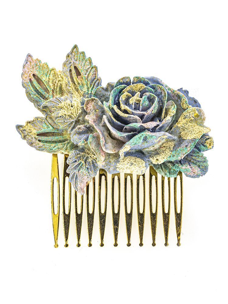 Peinecillo de flamenca en tonos pastel con reflejos oro, detalle floral, peines metálicos que facilitan el agarre al pelo de la flamenca, y con medidas de: 65 x 70 mm. Elaborado artesanalmente en Sevilla.