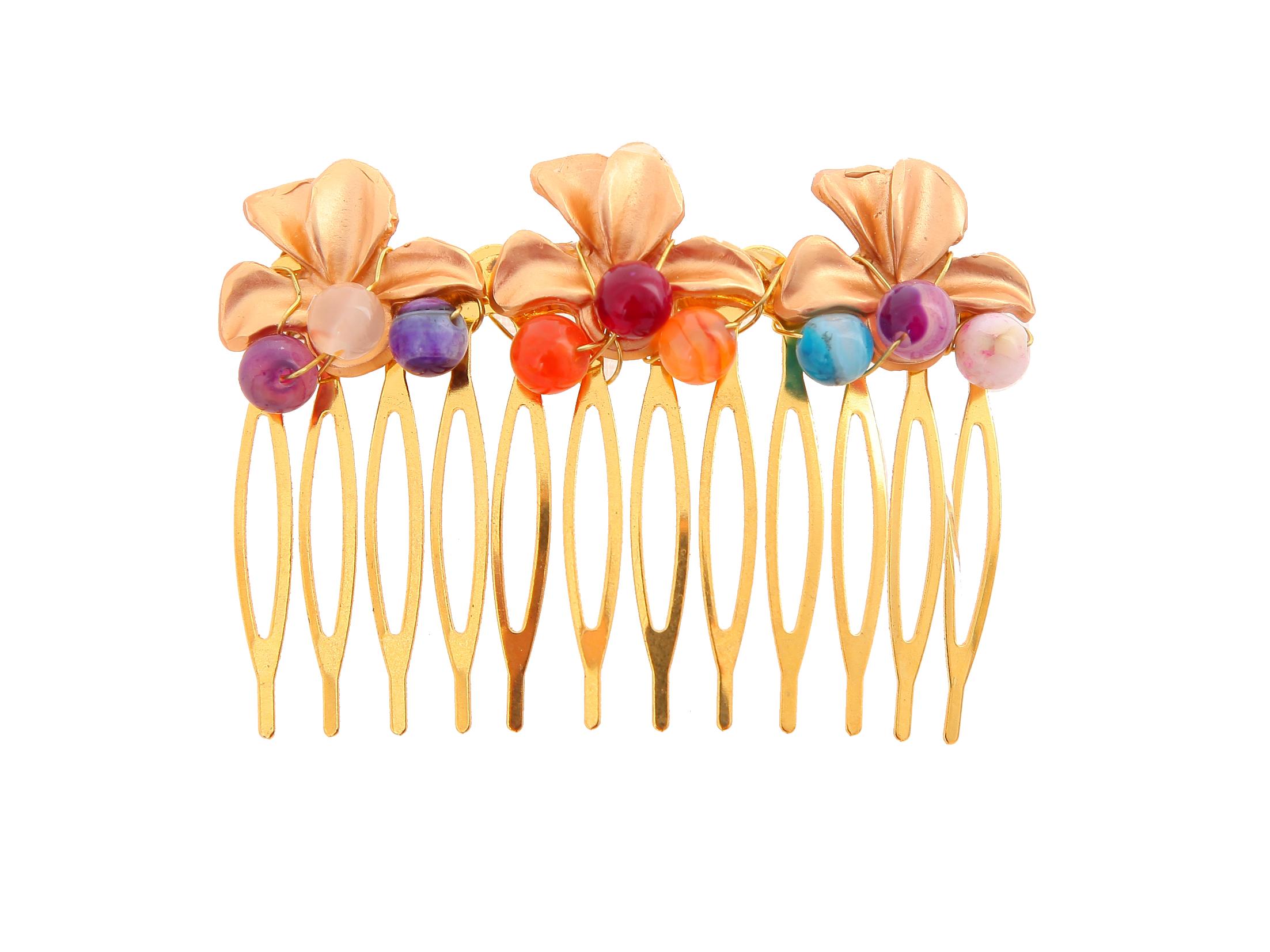 Peinecillo con fornitura de hoja y bolas de piedra Ágata en multicolor. Medidas aproximadas ancho x largo, 75x50mm. Fabricado artesanalmente en la provincia de Sevilla.